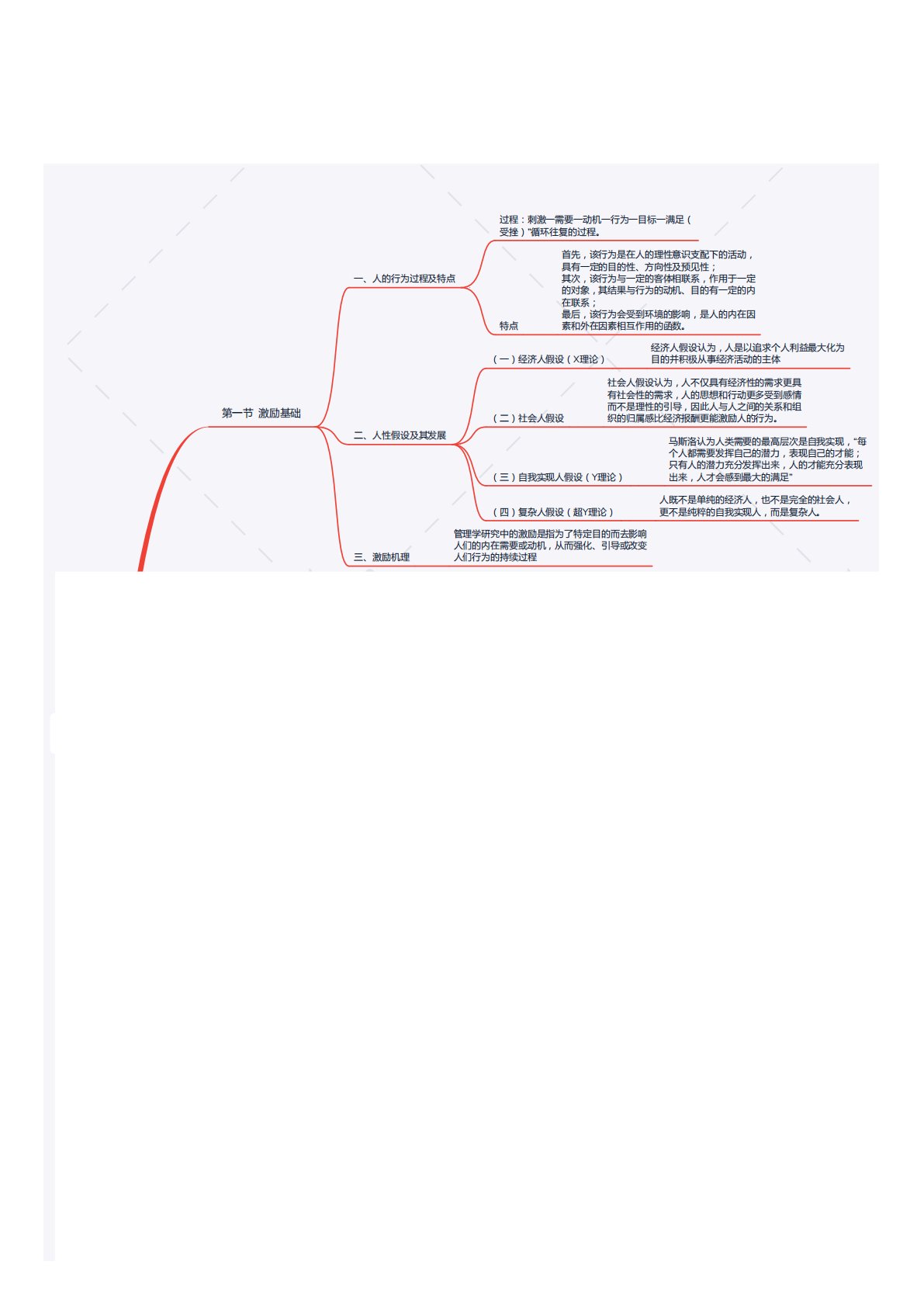 第一节激励基础一、人的行为过程及特点二、人性假设及其发展三、激励机理过程:刺激一需要一动机一行为一目标一满足(受挫)”循环往复的过程。特点首先,该行为是在人的理性意识支配下的活动,具有一定的目的性、方向性及预见性;其次,该行为与一定的客体相联系,作用于一定的对象,其结果与行为的动机、目的有一定的内在联系;最后,该行为会受到环境的影响,是人的内在因素和外在因素相互作用的函数。(一)经济人假设(X理论)(二)社会人假设(三)自我实现人假设(Y理论)(四)复杂人假设(超Y理论)管理学研究中的激励是指为了特定目的而去影响人们的内在需要或动机,从而强化、引导或改变人们行为的持续过程经济人假设认为,人是以...