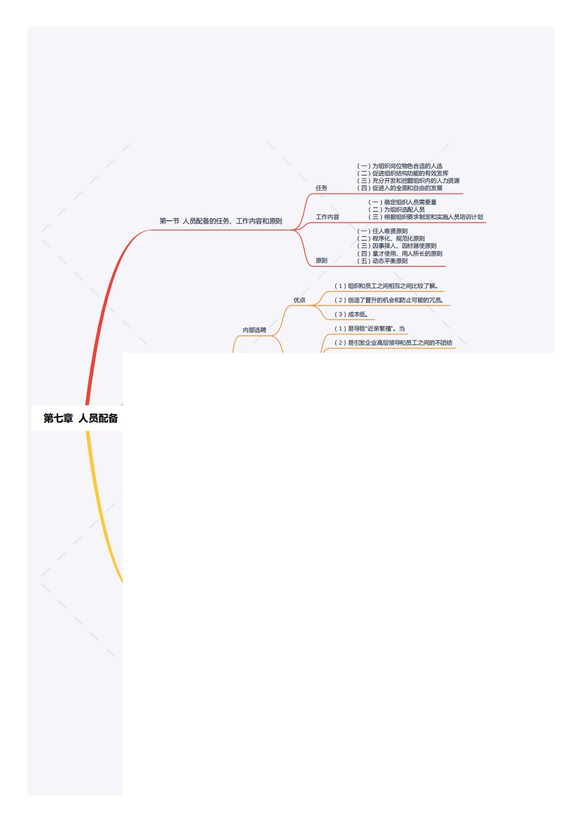 第七章人员配备第一节人员配备的任务、工作内容和原则任务工作内容原则(一)为组织岗位物色合适的人选(二)促进组织结构功能的有效发挥(三)充分开发和挖掘组织内的人力资源(四)促进入的全面和自由的发展(一)确定组织人员需要量(二)为组织选配人员(三)根据组织要求制定和实施人员培训计划(一)任人唯贤原则(二)程序化、规范化原则(三)因事择人、因材器使原则(四)量才使用、用人所长的原则(五)动态平衡原则内部选聘优点(1)组织和员工之间相互之间比较了解。(2)创造了晋升的机会和防止可能的冗员。(3)成本低。(1)易导致“近亲繁殖”。当(2)易引发企业高层领导和员工之间的不团结第七章人员配备第一节人员配备的...