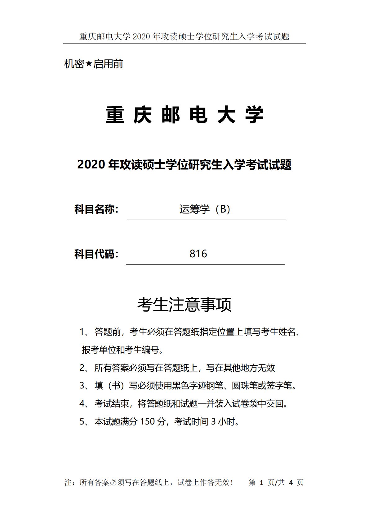 重庆邮电大学2020年攻读硕士学位研究生入学考试试题注:所有答案必须写在答题纸上,试卷上作答无效!第1页/共4页机密启用前重庆邮电大学2020年攻读硕士学位研究生入学考试试题科目名称:运筹学(B)科目代码:816考生注意事项1、答题前,考生必须在答题纸指定位置上填写考生姓名、报考单位和考生编号。2、所有答案必须写在答题纸上,写在其他地方无效3、填(书)写必须使用黑色字迹钢笔、圆珠笔或签字笔。4、考试结束,将答题纸和试题一并装入试卷袋中交回。5、本试题满分150分,考试时间3小时。重庆邮电大学2020年攻读硕士学位研究生入学考试试题注:所有答案必须写在答题纸上,试卷上作答无效!第2页/共4页一...