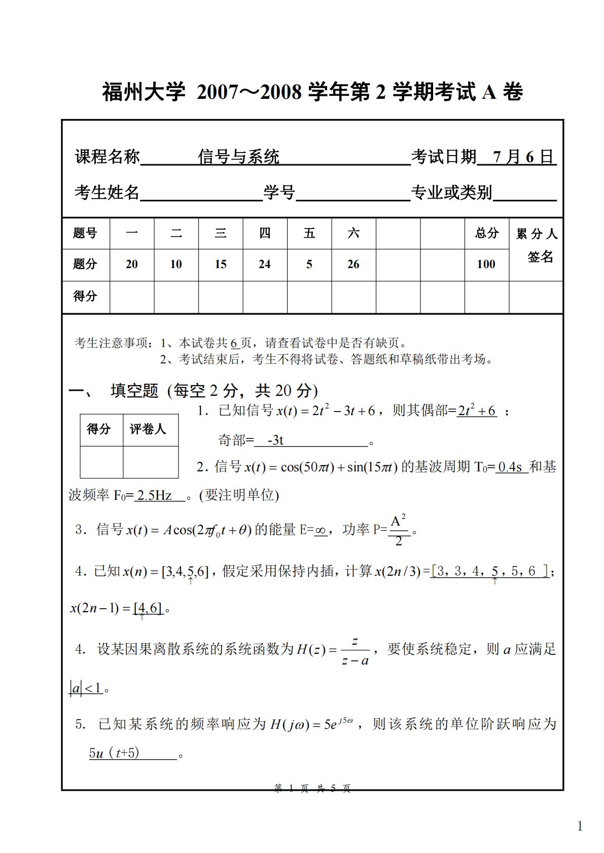 第1页共5页福州大学2007~2008学年第2学期考试A卷课程名称信号与系统考试日期7月6日考生姓名学号专业或类别题号一二三四五六总分累分人签名题分20101524526100得分考生注意事项:1、本试卷共6页,请查看试卷中是否有缺页。2、考试结束后,考生不得将试卷、答题纸和草稿纸带出考场。一、填空题(每空2分,共20分)1.已知信号632)(2tttx,则其偶部=226t;奇部=-3t。2.信号)15sin()50cos()(tttx的基波周期T0=0.4s和基波频率F0=2.5Hz。(要注明单位)3.信号)2cos()(0tfAtx的能量E=,功率P=2A2。4....
