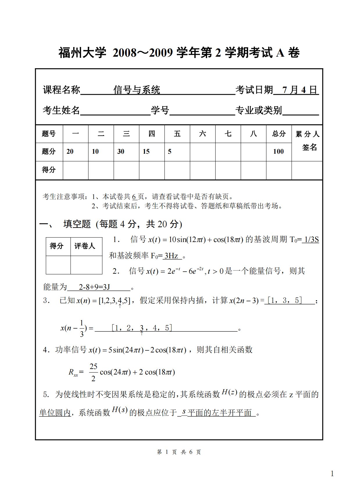 第1页共6页福州大学2008~2009学年第2学期考试A卷课程名称信号与系统考试日期7月4日考生姓名学号专业或类别题号一二三四五六七八总分累分人签名题分201030155100得分考生注意事项:1、本试卷共6页,请查看试卷中是否有缺页。2、考试结束后,考生不得将试卷、答题纸和草稿纸带出考场。一、填空题(每题4分,共20分)1.信号)18cos()12sin(10)(tttx的基波周期T0=1/3S和基波频率F0=3Hz。2.信号0,62)(2teetxtt是一个能量信号,则其能量为2-8+9=3J。3.已知]5,4,3,2,1[)(nx,假定采用保持内插,计算)32(n...