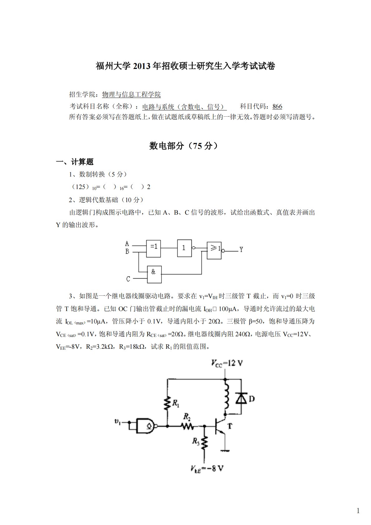 福州大学2013年招收硕士研究生入学考试试卷招生学院:物理与信息工程学院考试科目名称(全称):电路与系统(含数电、信号)科目代码:866所有答案必须写在答题纸上,做在试题纸或草稿纸上的一律无效。答题时必须写清题号。数电部分(75分)一、计算题1、数制转换(5分)(125)10=()16=()22、逻辑代数基础(10分)由逻辑门构成图示电路中,已知A、B、C信号的波形,试给出函数式、真值表并画出Y的输出波形。3、如图是一个继电器线圈驱动电路。要求在v1=VIH时三级管T截止,而v1=0时三级管T饱和导通。已知OC门输出管截止时的漏电流IOH≦100μA,导通时允许流过的最大电流IOL(max)=...