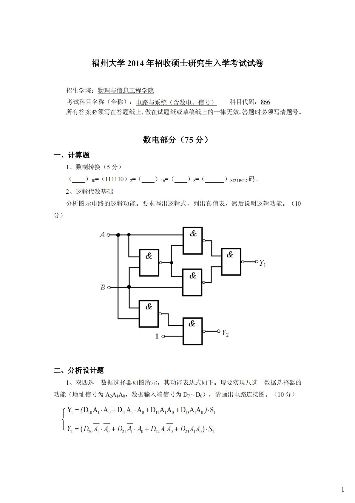 福州大学2014年招收硕士研究生入学考试试卷招生学院:物理与信息工程学院考试科目名称(全称):电路与系统(含数电、信号)科目代码:866所有答案必须写在答题纸上,做在试题纸或草稿纸上的一律无效。答题时必须写清题号。数电部分(75分)一、计算题1、数制转换(5分)(____)10=(111110)2=(____)16=(____)8=(______)8421BCD码。2、逻辑代数基础分析图示电路的逻辑功能。要求写出逻辑式,列出真值表,然后说明逻辑功能。(10分)二、分析设计题1、双四选一数据选择器如图所示,其功能表达式如下。现要实现八选一数据选择器的功能(地址信号为A2A1A0,数据输入端信号为...