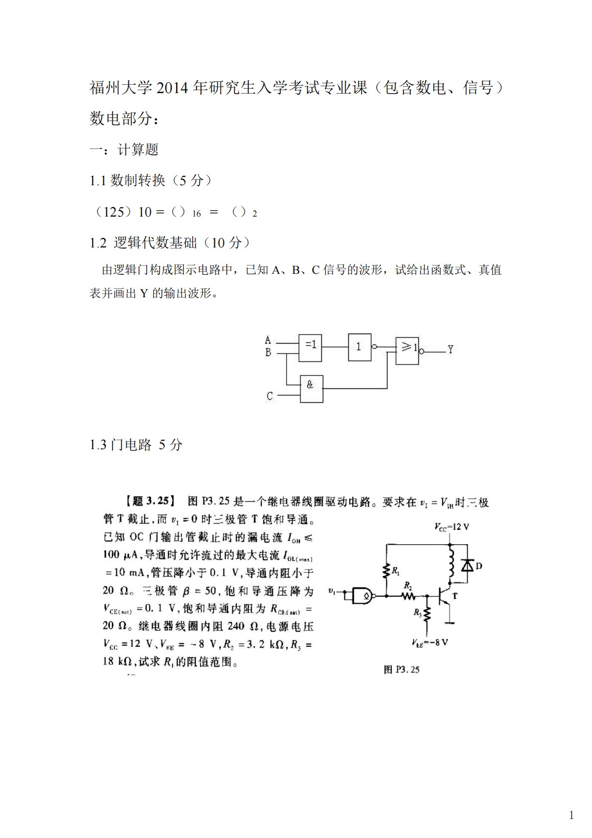 福州大学2014年研究生入学考试专业课(包含数电、信号)数电部分:一:计算题1.1数制转换(5分)(125)10=()16=()21.2逻辑代数基础(10分)由逻辑门构成图示电路中,已知A、B、C信号的波形,试给出函数式、真值表并画出Y的输出波形。1.3门电路5分1二分析设计题2.1数据选择器10分组合逻辑电路分析。采用4选1数据选择器和逻辑门构成图示电路。1)写出下图的函数真值表和逻辑表达式。2)叙述该电路的功能。2.2时序电路10分如图所示为时序逻辑电路。试写出输出方程、驱动方程、状态方程,列出状态转换真值表,画出状态转换图。说明其逻辑功能。2.3计数器10分四位二进制加法计数器74LS1...