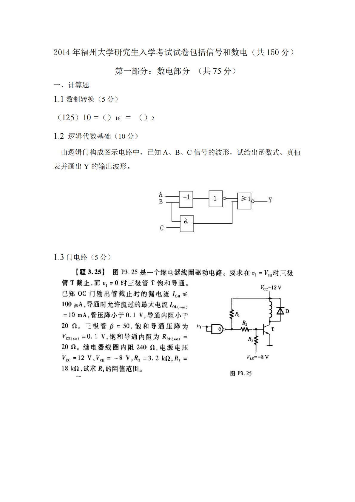2014年福州大学研究生入学考试试卷包括信号和数电(共150分)第一部分:数电部分(共75分)一、计算题1.1数制转换(5分)(125)10=()16=()21.2逻辑代数基础(10分)由逻辑门构成图示电路中,已知A、B、C信号的波形,试给出函数式、真值表并画出Y的输出波形。1.3门电路(5分)二、分析设计题2.1组合逻辑电路分析:数据选择器(10分)采用4选1数据选择器和逻辑门构成图示电路。1)写出下图的函数真值表和逻辑表达式。2)叙述该电路的功能。2.2时序电路(10分)如图所示为时序逻辑电路。试写出输出方程、驱动方程、状态方程,列出状态转换真值表,画出状态转换图。说明其逻辑功能。2.3计...