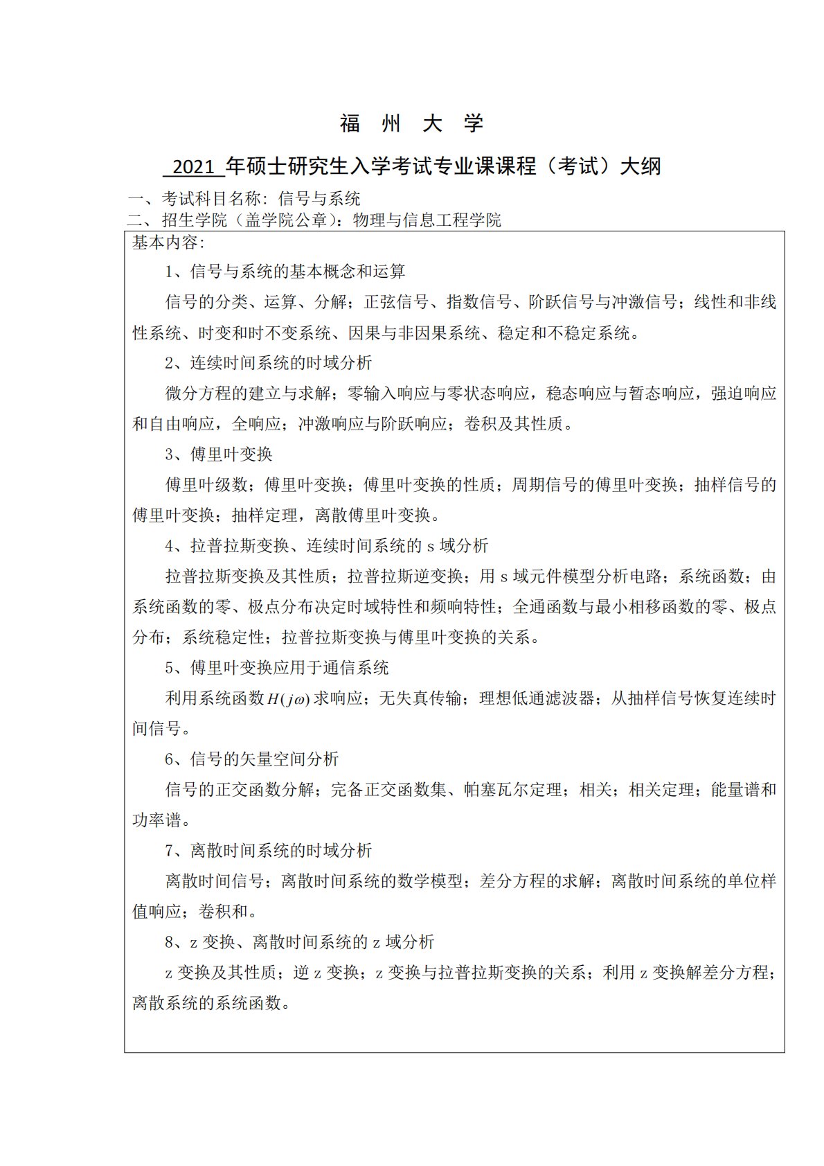 福州大学2021年硕士研究生入学考试专业课课程(考试)大纲一、考试科目名称:信号与系统二、招生学院(盖学院公章):物理与信息工程学院基本内容:1、信号与系统的基本概念和运算信号的分类、运算、分解;正弦信号、指数信号、阶跃信号与冲激信号;线性和非线性系统、时变和时不变系统、因果与非因果系统、稳定和不稳定系统。2、连续时间系统的时域分析微分方程的建立与求解;零输入响应与零状态响应,稳态响应与暂态响应,强迫响应和自由响应,全响应;冲激响应与阶跃响应;卷积及其性质。3、傅里叶变换傅里叶级数;傅里叶变换;傅里叶变换的性质;周期信号的傅里叶变换;抽样信号的傅里叶变换;抽样定理,离散傅里叶变换。4、拉普拉斯...