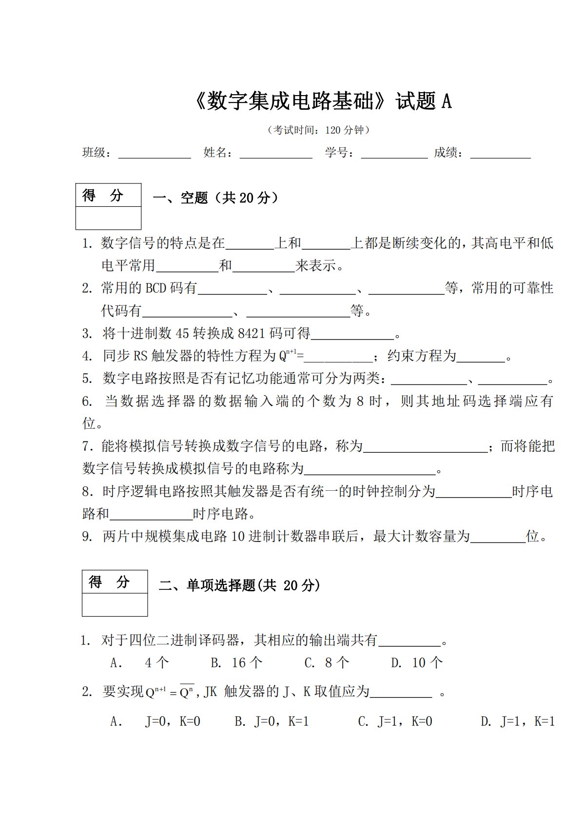 《数字集成电路基础》试题A(考试时间:120分钟)班级:姓名:学号:成绩:一、空题(共20分)1.数字信号的特点是在上和上都是断续变化的,其高电平和低电平常用和来表示。2.常用的BCD码有、、等,常用的可靠性代码有、等。3.将十进制数45转换成8421码可得。4.同步RS触发器的特性方程为Qn+1=__________;约束方程为。5.数字电路按照是否有记忆功能通常可分为两类:、。6.当数据选择器的数据输入端的个数为8时,则其地址码选择端应有位。7.能将模拟信号转换成数字信号的电路,称为;而将能把数字信号转换成模拟信号的电路称为。8.时序逻辑电路按照其触发器是否有统一的时钟控制分为时序电路和时...