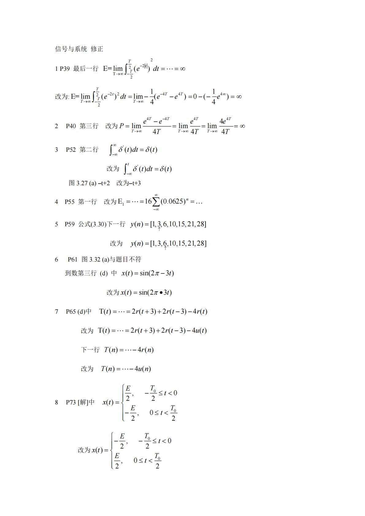 信号与系统修正1P39最后一行222T2E=lim()TtTedt改为:224442211E=lim()lim()0()44TtTTTTTedteee2P40第三行改为44444limlimlim444TTTTTTTeeeePTTT3P52第二行'()()tdtt改为'()()ttdtt图3.27(a)–t+2改为–t+34P55第一行改为1E16(0.0625)n5P59公式(3.30)下一行()[1,3,6,10,15,21,28]yn改为()[1,3,6,10,1...