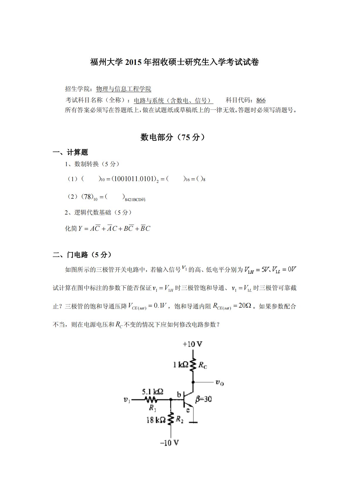 福州大学2015年招收硕士研究生入学考试试卷招生学院:物理与信息工程学院考试科目名称(全称):电路与系统(含数电、信号)科目代码:866所有答案必须写在答题纸上,做在试题纸或草稿纸上的一律无效。答题时必须写清题号。数电部分(75分)一、计算题1、数制转换(5分)(1)8162100101.1001011())()()(===(2)码)()(BCD84211078=2、逻辑代数基础(5分)化简CBCBCACAY+++=二、门电路(5分)如图所示的三极管开关电路中,若输入信号1ν的高、低电平分别为试计算在图中标注的参数下能否保证HVv11=时三极管饱和导通、LVv11=时三极管可靠截止?三极管的饱...