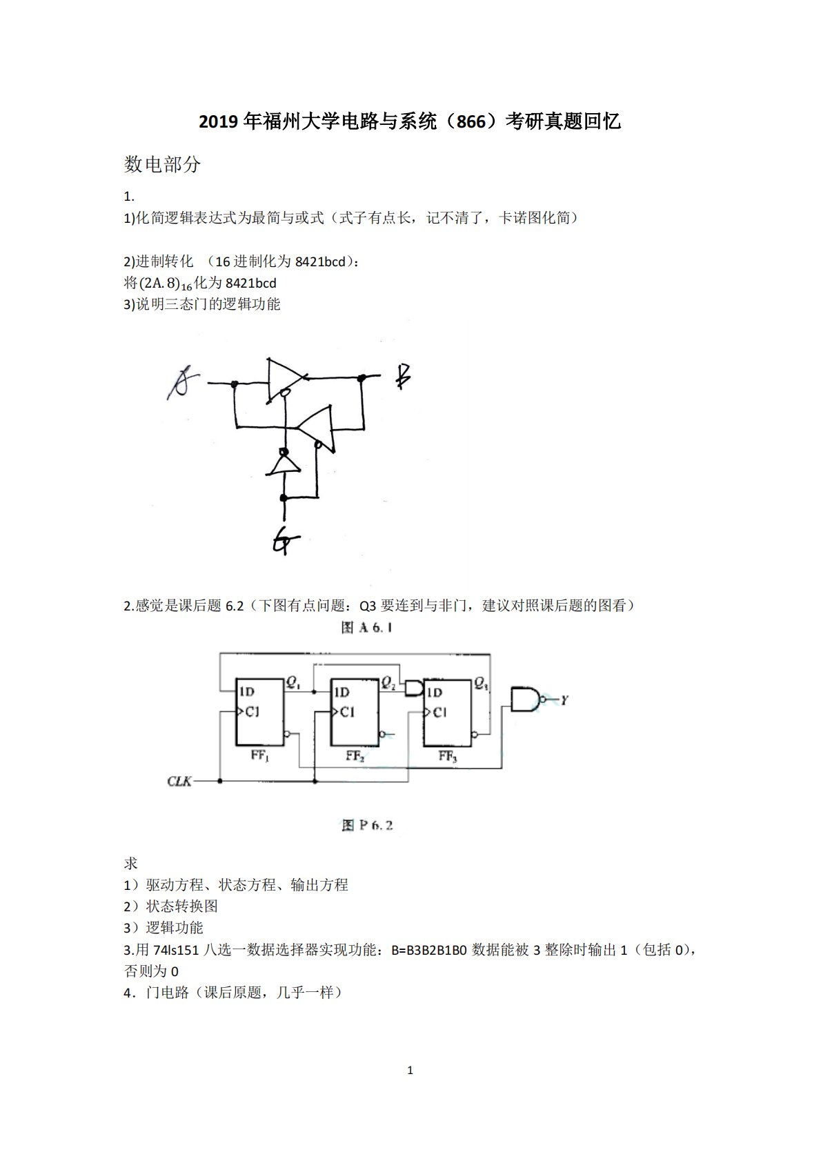 12019年福州大学电路与系统(866)考研真题回忆数电部分1.1)化简逻辑表达式为最简与或式(式子有点长,记不清了,卡诺图化简)2)进制转化(16进制化为8421bcd):将(2A.8)16化为8421bcd3)说明三态门的逻辑功能2.感觉是课后题6.2(下图有点问题:Q3要连到与非门,建议对照课后题的图看)求1)驱动方程、状态方程、输出方程2)状态转换图3)逻辑功能3.用74ls151八选一数据选择器实现功能:B=B3B2B1B0数据能被3整除时输出1(包括0),否则为04.门电路(课后原题,几乎一样)25.555定时器结合计数器考跟数电名校真题(金圣才)上这题很类似,真题是多谐振荡器+计...