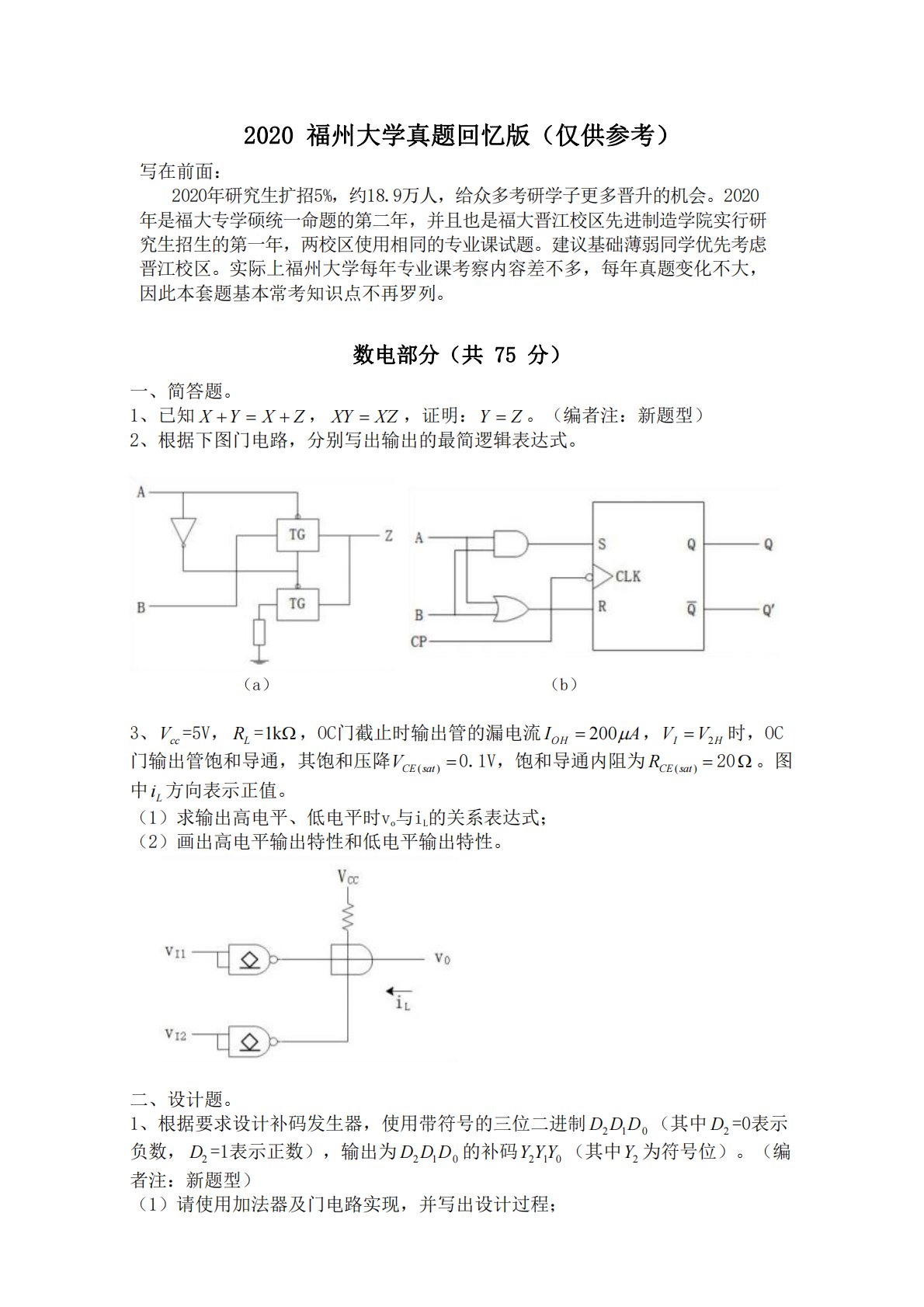 写在前面:2020福州大学真题回忆版(仅供参考)2020年研究生扩招5%,约18.9万人,给众多考研学子更多晋升的机会。2020年是福大专学硕统一命题的第二年,并且也是福大晋江校区先进制造学院实行研究生招生的第一年,两校区使用相同的专业课试题。建议基础薄弱同学优先考虑晋江校区。实际上福州大学每年专业课考察内容差不多,每年真题变化不大,因此本套题基本常考知识点不再罗列。数电部分(共75分)一、简答题。1、已知ZXYX,XZXY,证明:ZY。(编者注:新题型)2、根据下图门电路,分别写出输出的最简逻辑表达式。3、ccV=5V,LR=k1,OC门截止时输出管的漏电流AIOH200,H...