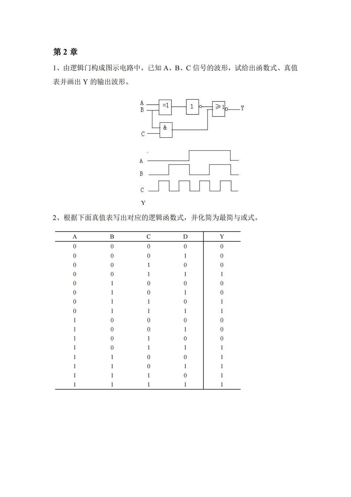 第2章1、由逻辑门构成图示电路中,已知A、B、C信号的波形,试给出函数式、真值表并画出Y的输出波形。2、根据下面真值表写出对应的逻辑函数式,并化简为最简与或式。ABCDY00000000100010000111010000101001101011111000010010101001011111001110111110111111Y第3章1、已知TTL与非门输出高电平VOH=3.5V,输出端低电平VOL=0.2V,带灌电流负载最大值IOL=12mA,发光二极管导通电压VD=1.5V,工作电流10mA≤ID≤15mA,问:(1)与非门处于什么状态下发光二极管才能发光?(2)估算电路中R的取值范围。...