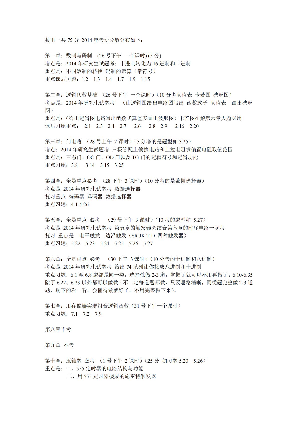 数电一共75分2014年考研分数分布如下:第一章:数制与码制(26号下午一个课时)(5分)考点是:2014年研究生试题考:十进制转化为16进制和二进制重点是:不同数制的转换码制的运算(带符号)重点课后习题:1.21.31.41.71.91.15第二章:逻辑代数基础(26号下午一个课时)(10分考真值表卡若图波形图)考点是:2014年研究生试题考(由逻辑图给出电路图写出函数式子真值表画出波形图)重点是:(给出逻辑图电路写出函数式真值表画出波形图)卡若图在解第六章大题必用课后习题重点:2.12.32.42.72.62.82.92.162.20第三章:门电路(28号上午2课时)(5分考的是题型如3....
