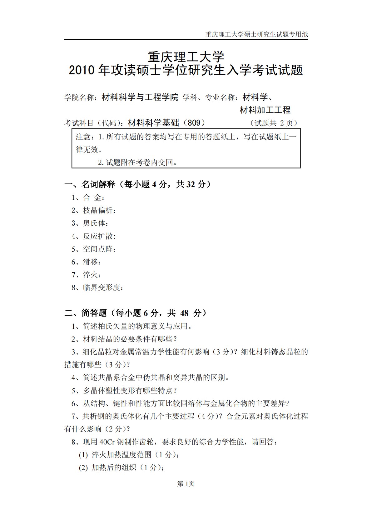 重庆理工大学硕士研究生试题专用纸第1页重庆理工大学2010年攻读硕士学位研究生入学考试试题学院名称:材料科学与工程学院学科、专业名称:材料学、材料加工工程考试科目(代码):材料科学基础(809)(试题共2页)注意:1.所有试题的答案均写在专用的答题纸上,写在试题纸上一律无效。2.试题附在考卷内交回。一、名词解释(每小题4分,共32分)1、合金:2、枝晶偏析:3、奥氏体:4、反应扩散:5、空间点阵:6、滑移:7、淬火:8、临界变形度:二、简答题(每小题6分,共48分)1、简述柏氏矢量的物理意义与应用。2、材料结晶的必要条件有哪些?3、细化晶粒对金属常温力学性能有何影响(3分)?细化材料铸态晶粒的...