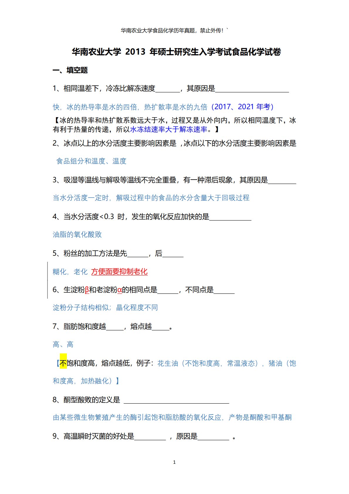 华南农业大学食品化学历年真题,禁止外传!`1华南农业大学2013年硕士研究生入学考试食品化学试卷一、填空题1、相同温差下,冷冻比解冻速度,其原因是快,冰的热导率是水的四倍,热扩散率是水的九倍(2017、2021年考)【冰的热导率和热扩散系数远大于水,过程又是从外向内,所以相同温度下,冰有利于热量的传递,所以水冻结速率大于解冻速率。】2、冰点以上的水分活度主要影响因素是,冰点以下的水分活度主要影响因素是食品组分和温度、温度3、吸湿等温线与解吸等温线不完全重叠,有一种滞后现象,其原因是当水分活度一定时,解吸过程中的食品的水分含量大于回吸过程4、当水分活度