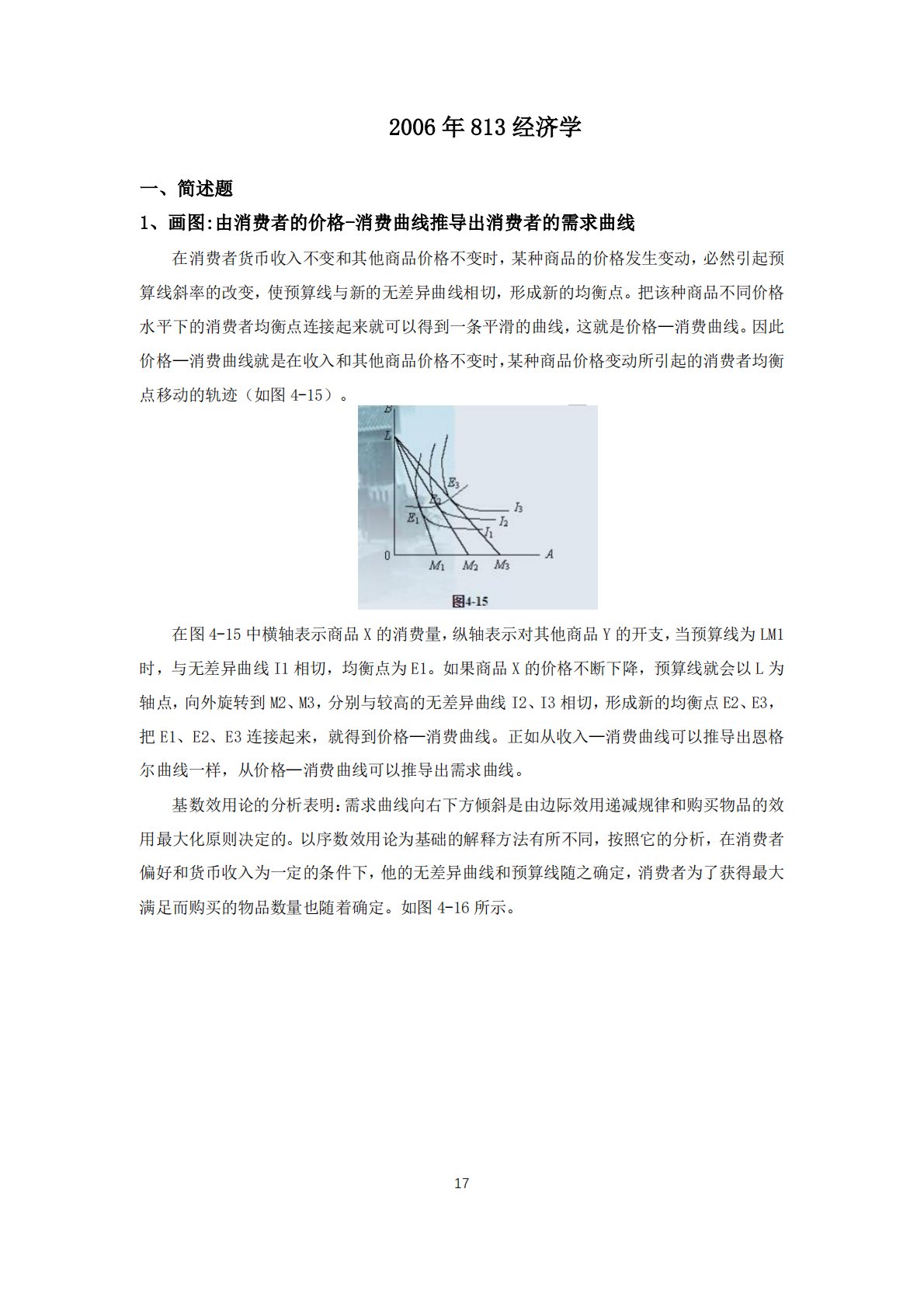 172006年813经济学一、简述题1、画图:由消费者的价格-消费曲线推导出消费者的需求曲线在消费者货币收入不变和其他商品价格不变时,某种商品的价格发生变动,必然引起预算线斜率的改变,使预算线与新的无差异曲线相切,形成新的均衡点。把该种商品不同价格水平下的消费者均衡点连接起来就可以得到一条平滑的曲线,这就是价格—消费曲线。因此价格—消费曲线就是在收入和其他商品价格不变时,某种商品价格变动所引起的消费者均衡点移动的轨迹(如图4-15)。在图4-15中横轴表示商品X的消费量,纵轴表示对其他商品Y的开支,当预算线为LM1时,与无差异曲线I1相切,均衡点为E1。如果商品X的价格不断下降,预算线就会以L...
