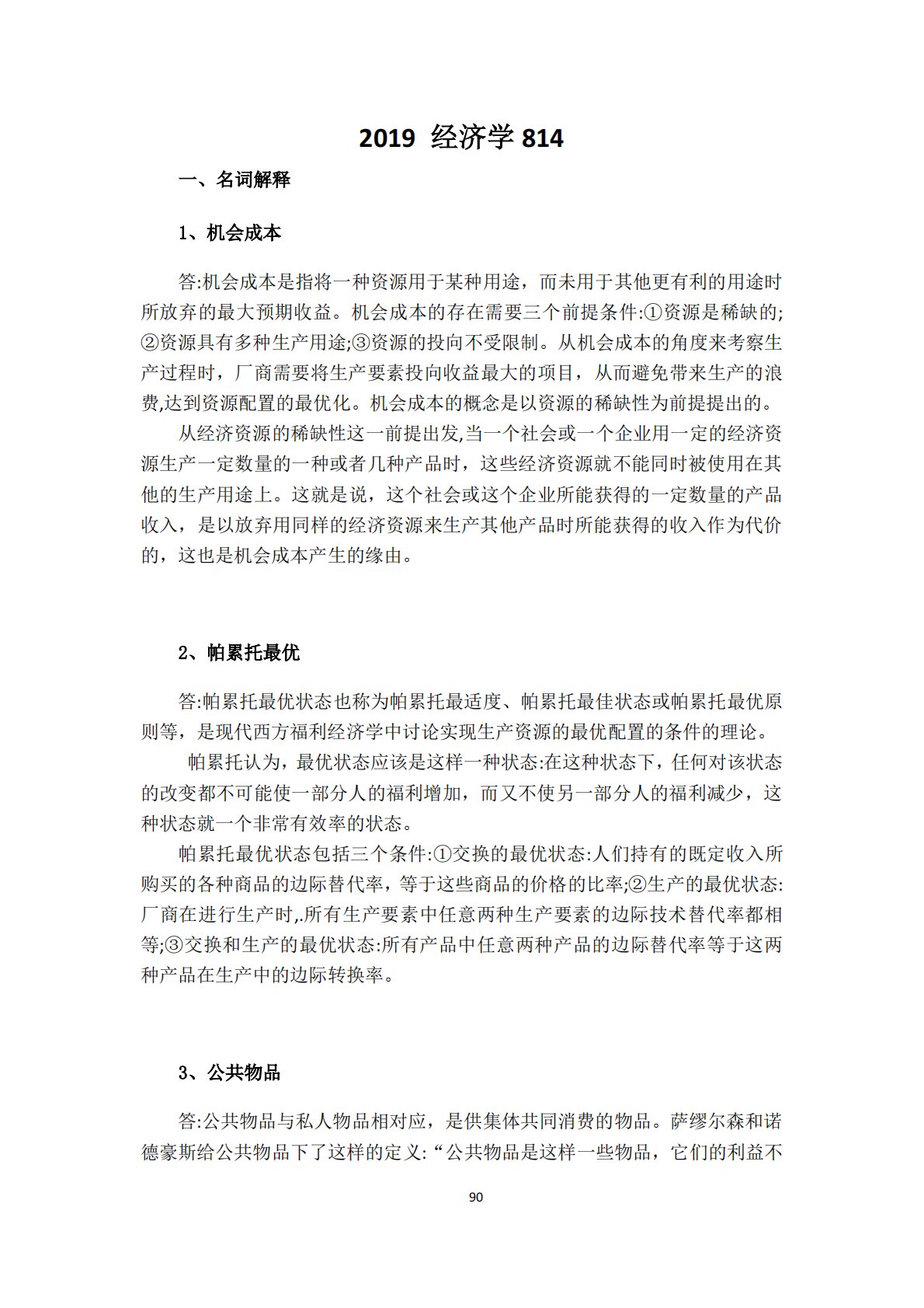 902019经济学814一、名词解释1、机会成本答:机会成本是指将一种资源用于某种用途,而未用于其他更有利的用途时所放弃的最大预期收益。机会成本的存在需要三个前提条件:①资源是稀缺的;②资源具有多种生产用途;③资源的投向不受限制。从机会成本的角度来考察生产过程时,厂商需要将生产要素投向收益最大的项目,从而避免带来生产的浪费,达到资源配置的最优化。机会成本的概念是以资源的稀缺性为前提提出的。从经济资源的稀缺性这一前提出发,当一个社会或一个企业用一定的经济资源生产一定数量的一种或者几种产品时,这些经济资源就不能同时被使用在其他的生产用途上。这就是说,这个社会或这个企业所能获得的一定数量的产品收入,...