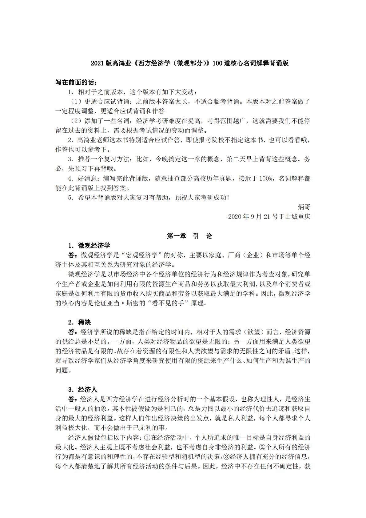 2021版高鸿业《西方经济学(微观部分)》100道核心名词解释背诵版写在前面的话:1.相对于之前版本,这个版本有如下大变动:(1)更适合应试背诵:之前版本答案太长,不适合临考背诵。本版本对之前答案做了一定程度调整,更适合应试背诵和作答。(2)添加了一些名词:经济学考研难度在提高,考得范围越广,这就需要我们不能停留在过去的资料上,需要根据考试情况的变动而调整。2.高鸿业老师这本书特别适合应试作答,即使报考院校不指定这本书,也可以看看哦,作答也可以参考下。3.推荐一个复习方法:比如,今晚搞定这一章的概念,第二天早上背背这些概念。务必,先预习下再背哦。4.好消息:编写完此背诵版,随意抽查部分高校历年...