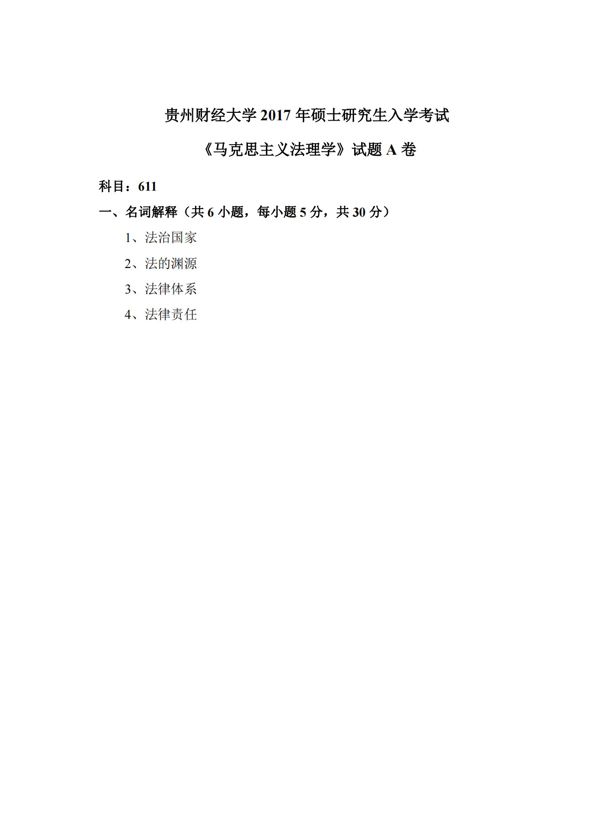 科目:611一、名词解释(共6小题,每小题5分,共30分贵州财经大学2017年硕士研究生入学考试《马克思主义法理学》试题A卷)1、法治国家2、法的渊源3、法律体系4、法律责任科目:611一、名词解释(共6小题,每小题5分,共30分贵州财经大学2017年硕士研究生入学考试《马克思主义法理学》试题A卷)1、法治国家2、法的渊源3、法律体系4、法律责任5、法典编纂6、法律部门二、分析判断题(共3小题,每小题10分,共30分)1、法律规则是由主体、客体和内容三个要素构成的。2、行政立法与代议制下议会立法一样都体现了民意。3、法律对社会关系的调整作用具有完美性。三、简述题(共5小题,每小题10分,共50...