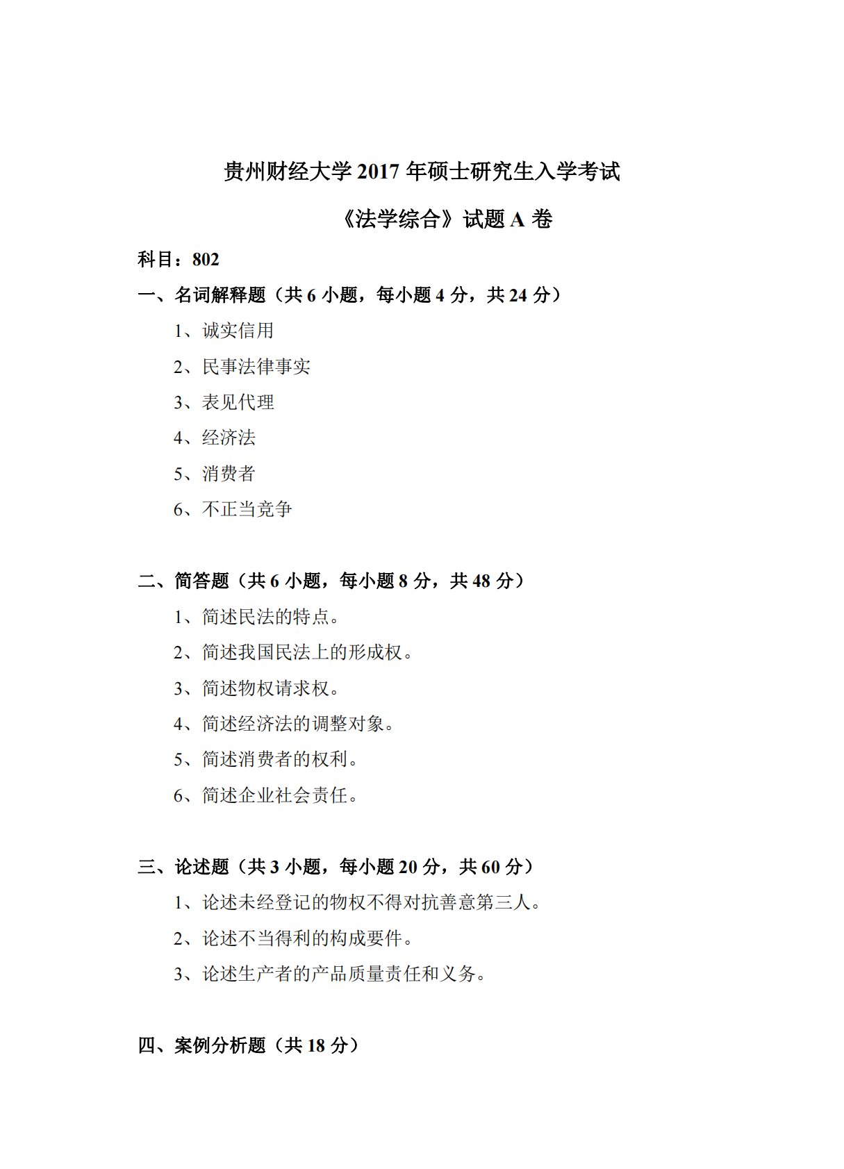 科目:802一、名词解释题(共6小题,每小题4分,共24分贵州财经大学2017年硕士研究生入学考试《法学综合》试题A卷)1、诚实信用2、民事法律事实3、表见代理4、经济法5、消费者6、不正当竞争二、简答题(共6小题,每小题8分,共48分)1、简述民法的特点。2、简述我国民法上的形成权。3、简述物权请求权。4、简述经济法的调整对象。5、简述消费者的权利。6、简述企业社会责任。三、论述题(共3小题,每小题20分,共60分)1、论述未经登记的物权不得对抗善意第三人。2、论述不当得利的构成要件。3、论述生产者的产品质量责任和义务。四、案例分析题(共18分)甲有一手表,委托乙保管,乙擅自将手表卖于不知情...