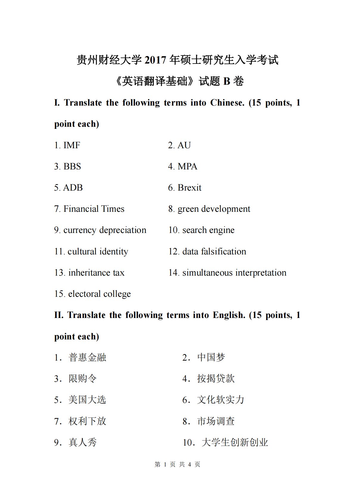 第1页共4页贵州财经大学2017年硕士研究生入学考试《英语翻译基础》试题B卷I.TranslatethefollowingtermsintoChinese.(15points,1pointeach)1.IMF2.AU3.BBS4.MPA5.ADB6.Brexit7.FinancialTimes8.greendevelopment9.currencydepreciation10.searchengine11.culturalidentity12.datafalsification13.inheritancetax14.simultaneousinterpretation15.electoralc...