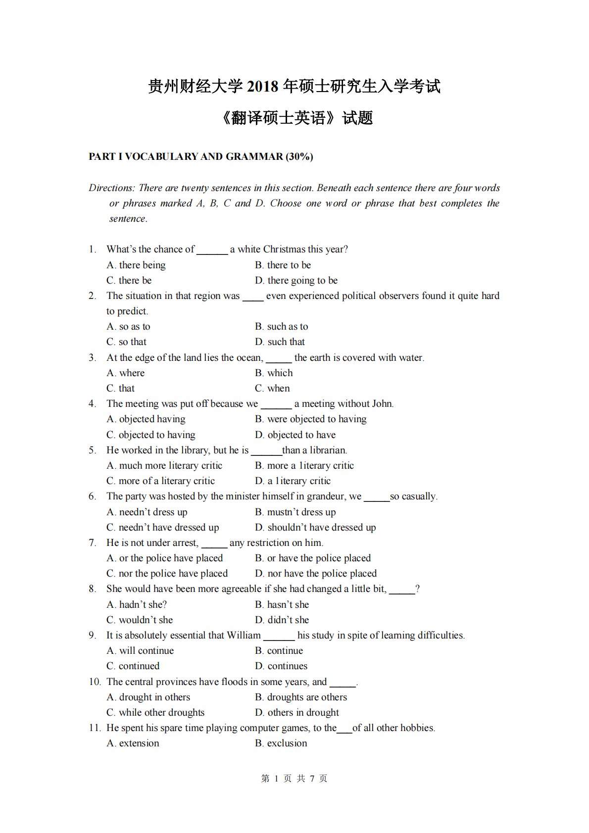 第1页共7页贵州财经大学2018年硕士研究生入学考试《翻译硕士英语》试题PARTIVOCABULARYANDGRAMMAR(30%)Directions:Therearetwentysentencesinthissection.BeneatheachsentencetherearefourwordsorphrasesmarkedA,B,CandD.Chooseonewordorphrasethatbestcompletesthesentence.1.What’sthechanceof______awhiteChristmasthisyear?A.therebeingB.theretobeC.t...