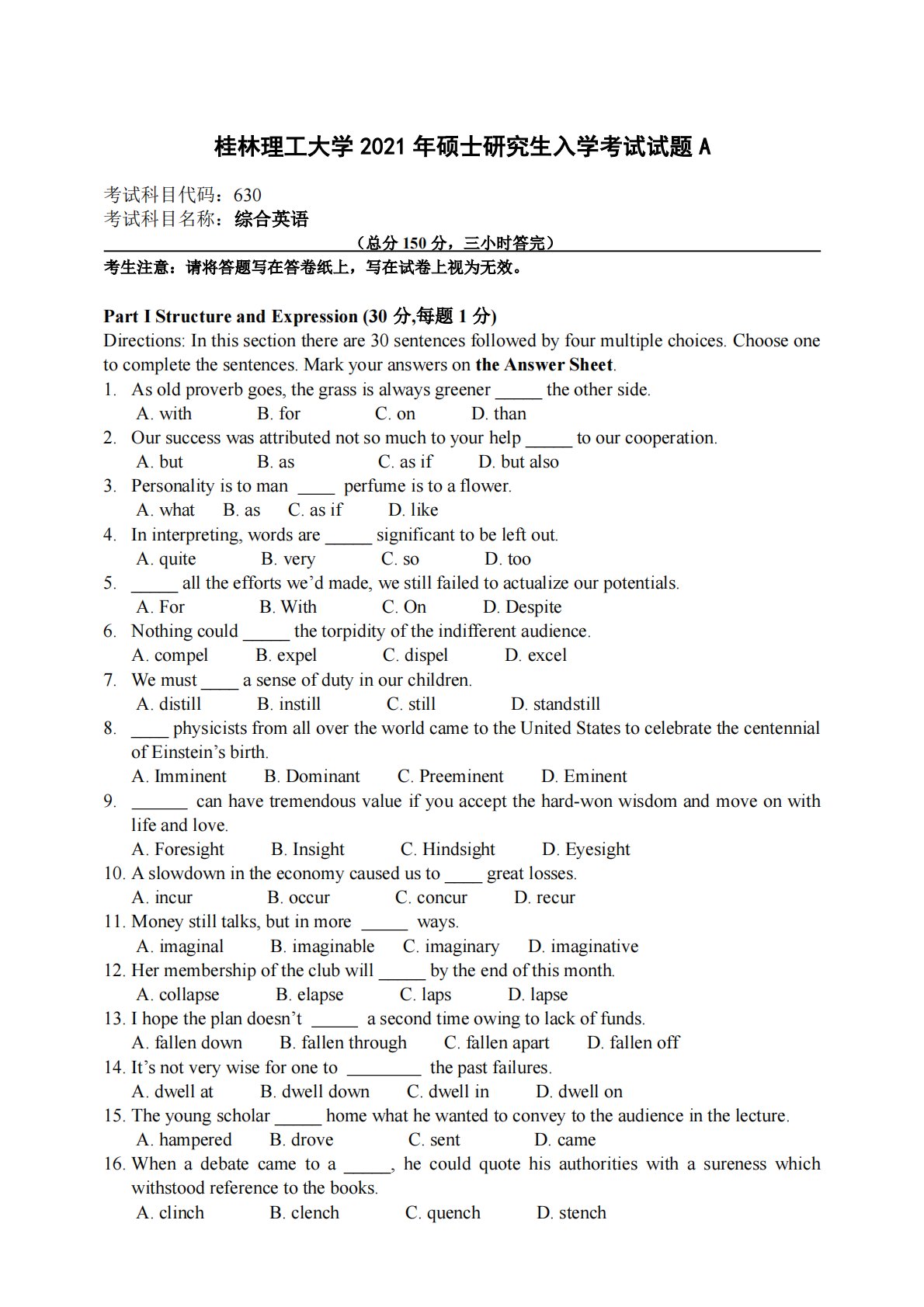 桂林理工大学2021年硕士研究生入学考试试题A考试科目代码:630考试科目名称:综合英语(总分150分,三小时答完)考生注意:请将答题写在答卷纸上,写在试卷上视为无效。PartIStructureandExpression(30分,每题1分)Directions:Inthissectionthereare30sentencesfollowedbyfourmultiplechoices.Chooseonetocompletethesentences.MarkyouranswersontheAnswerSheet.1.Asoldproverbgoes,thegrassisalwaysgreener...