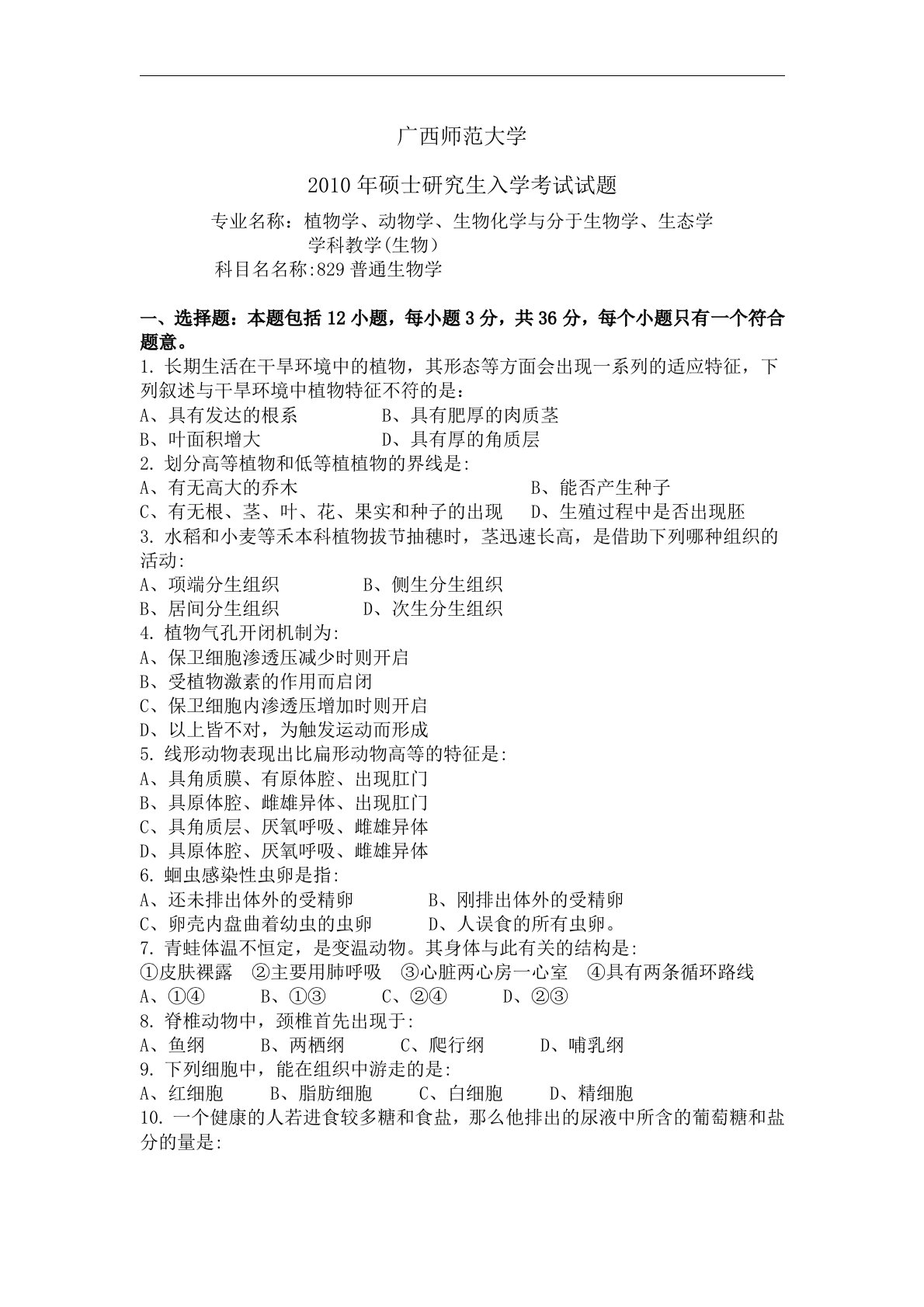 广西师范大学2010年硕士研究生入学考试试题专业名称:植物学、动物学、生物化学与分于生物学、生态学学科教学(生物)科目名名称:829普通生物学选择题:本题包括12小题,每小题3分,共36分,每个小题只有一个符合题意。长期生活在干旱环境中的植物,其形态等方面会出现一系列的适应特征,下列叙述与干旱环境中植物特征不符的是:具有发达的根系B、具有肥厚的肉质茎叶面积增大D、具有厚的角质层划分高等植物和低等植植物的界线是:A、有无高大的乔木B、能否产生种子C、有无根、茎、叶、花、果实和种子的出现D、生殖过程中是否出现胚水稻和小麦等禾本科植物拔节抽穗时,茎迅速长高,是借助下列哪种组织的活动:项端分生组织B、...