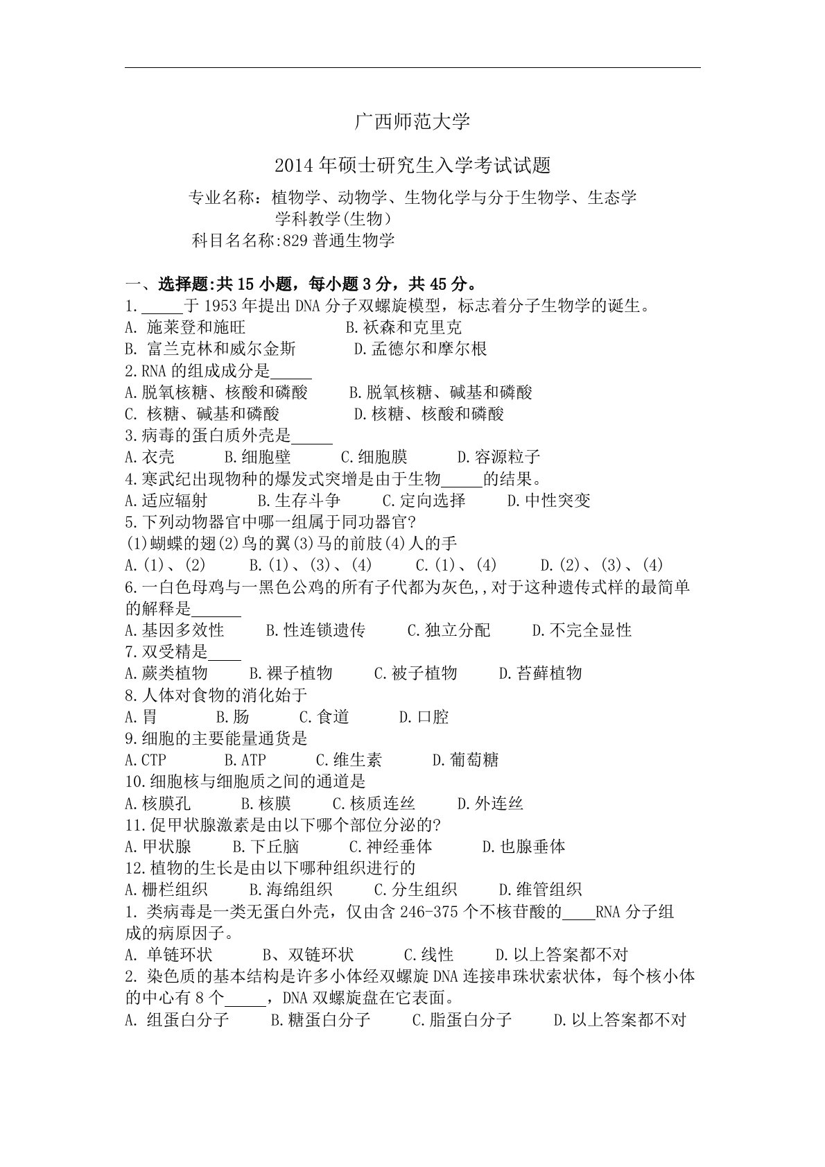 广西师范大学2014年硕士研究生入学考试试题专业名称:植物学、动物学、生物化学与分于生物学、生态学学科教学(生物)科目名名称:829普通生物学选择题:共15小题,每小题3分,共45分。1.于1953年提出DNA分子双螺旋模型,标志着分子生物学的诞生。施莱登和施旺B.袄森和克里克富兰克林和威尔金斯D.孟德尔和摩尔根2.RNA的组成成分是A.脱氧核糖、核酸和磷酸B.脱氧核糖、碱基和磷酸核糖、碱基和磷酸D.核糖、核酸和磷酸3.病毒的蛋白质外壳是A.衣壳B.细胞壁C.细胞膜D.容源粒子4.寒武纪出现物种的爆发式突增是由于生物的结果。A.适应辐射B.生存斗争C.定向选择D.中性突变5.下列动物器官中哪一...