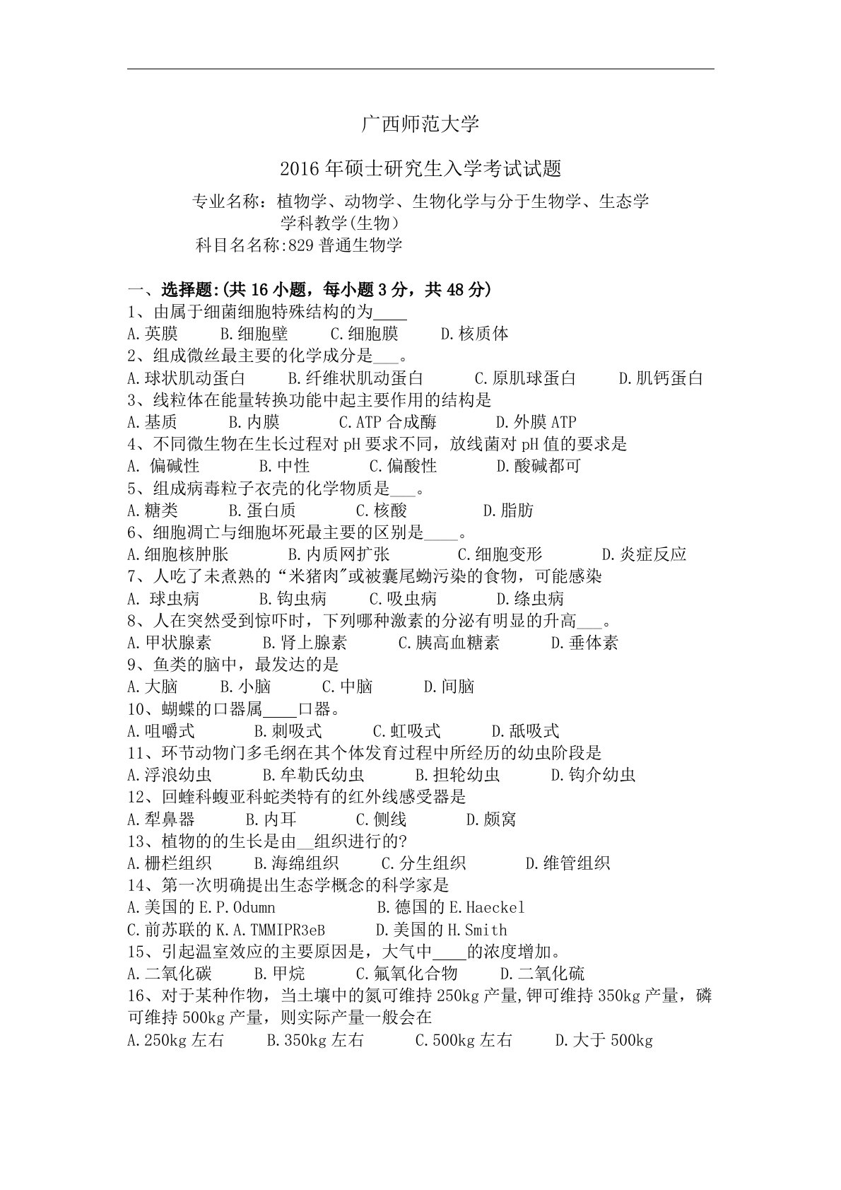 广西师范大学2016年硕士研究生入学考试试题专业名称:植物学、动物学、生物化学与分于生物学、生态学学科教学(生物)科目名名称:829普通生物学选择题:(共16小题,每小题3分,共48分)1、由属于细菌细胞特殊结构的为A.英膜B.细胞壁C.细胞膜D.核质体2、组成微丝最主要的化学成分是___。A.球状肌动蛋白B.纤维状肌动蛋白C.原肌球蛋白D.肌钙蛋白3、线粒体在能量转换功能中起主要作用的结构是A.基质B.内膜C.ATP合成酶D.外膜ATP4、不同微生物在生长过程对pH要求不同,放线菌对pH值的要求是偏碱性B.中性C.偏酸性D.酸碱都可5、组成病毒粒子衣壳的化学物质是___。A.糖类B.蛋白质C...