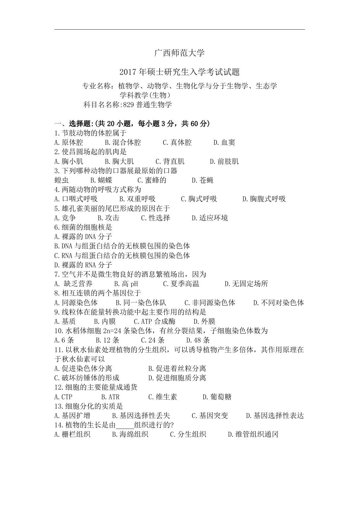 广西师范大学2017年硕士研究生入学考试试题专业名称:植物学、动物学、生物化学与分于生物学、生态学学科教学(生物)科目名名称:829普通生物学选择题:(共20小题,每小题3分,共60分)1.节肢动物的体腔属于A.原体腔B.混合体腔C.真体腔D.血窦2.使昌圆场起的肌肉是A.胸小肌B.胸大肌C.背直肌D.前肢肌3.下列哪种动物的口器展最原始的口器蝗虫B.蝴蝶C.蜜蜂的D.苍蝇4.两随动物的呼吸方式称为A.口咽式呼吸B.双重呼吸C.胸式呼吸D.胸腹式呼吸5.雄孔雀美丽的尾巴形成的原因在于A.竞争B.攻击C.性选择D.适应环境6.细菌的细胞核是A.裸露的DNA分子B.DNA与组蛋白结合的无核膜包围的...