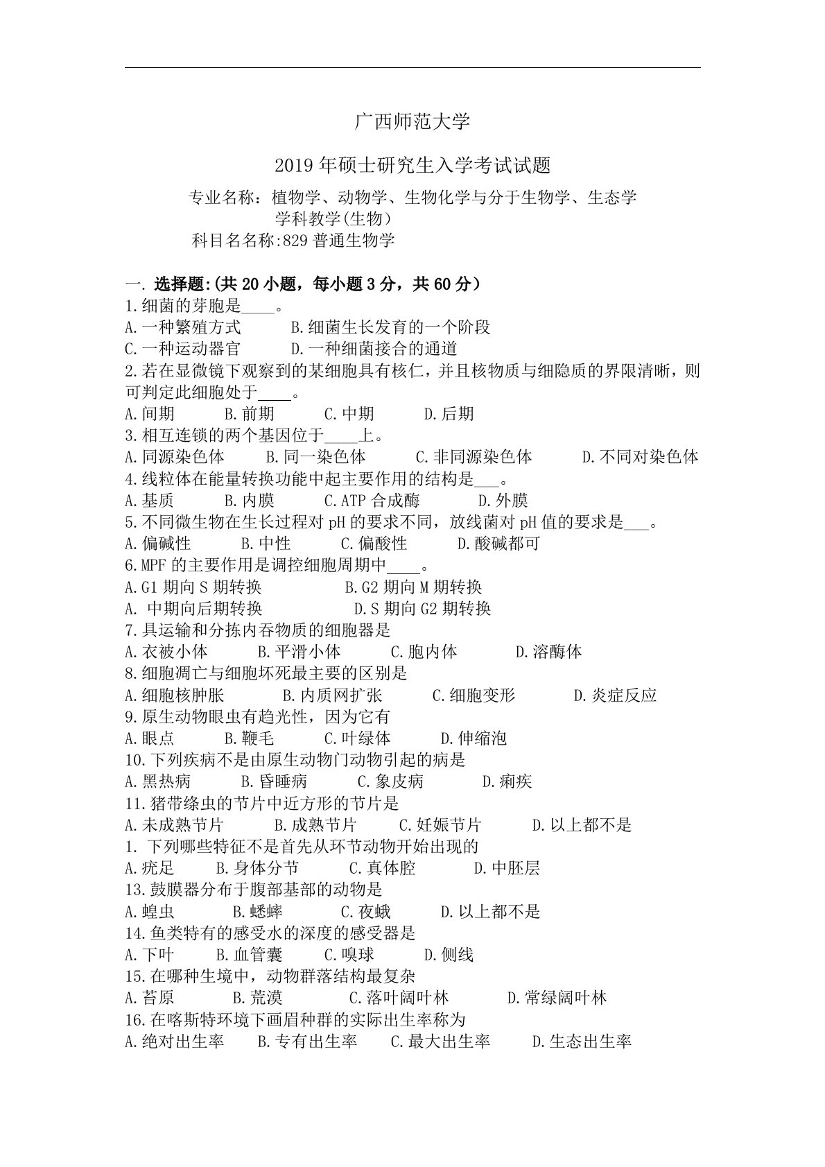广西师范大学2019年硕士研究生入学考试试题专业名称:植物学、动物学、生物化学与分于生物学、生态学学科教学(生物)科目名名称:829普通生物学选择题:(共20小题,每小题3分,共60分)1.细菌的芽胞是____。A.一种繁殖方式B.细菌生长发育的一个阶段C.一种运动器官D.一种细菌接合的通道2.若在显微镜下观察到的某细胞具有核仁,并且核物质与细隐质的界限清晰,则可判定此细胞处于。A.间期B.前期C.中期D.后期3.相互连锁的两个基因位于____上。A.同源染色体B.同一染色体C.非同源染色体D.不同对染色体4.线粒体在能量转换功能中起主要作用的结构是___。A.基质B.内膜C.ATP合成酶D....