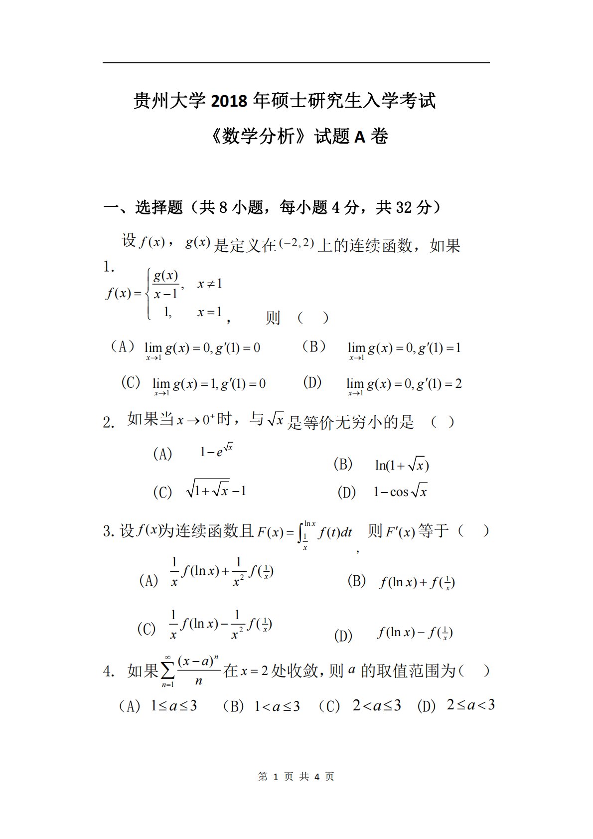 第1页共4页()fx1211(ln)()xfxfxx贵州大学2018年硕士研究生入学考试《数学分析》试题A卷一、选择题(共8小题,每小题4分,共32分)1.设()fx,()gx是定义在(2,2)上的连续函数,如果(),1()11,1gxxfxxx,则()(A)1lim()0,(1)0xgxg(B)1lim()0,(1)1xgxg(C)1lim()1,(1)0xgxg(D)1lim()0,(1)2xgxg2.如果当0x时,与x是等价无穷小的是()(A)1xe(B)(C)(D)3.设为连续函数且ln1()()xxFxftdt,则()F...