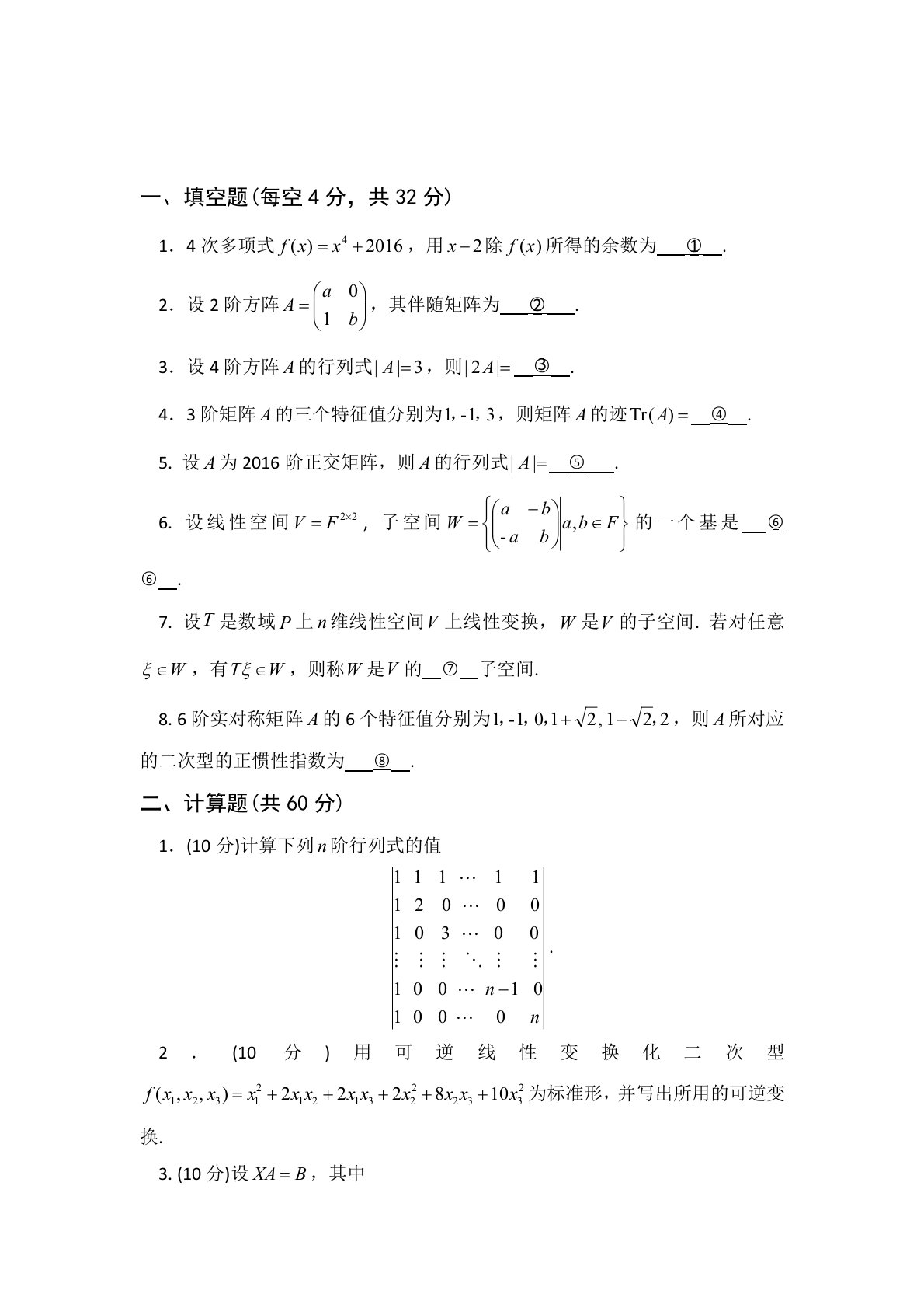 一、填空题(每空4分,共32分)二、计算题(共60分)1.(10分)计算下列阶行列式的值.2.(10分)用可逆线性变换化二次型为标准形,并写出所用的可逆变换.3.(10分)设,其中,求矩阵.4.(15分)在欧式空间中,有向量设,求的一个标准正交基.(这里表示向量的转置,表示由向量张成的空间).5.(15分)请问取什么值时,线性方程组有解?有解时,求解.(要求:将解表示为特解加上导出组基础解