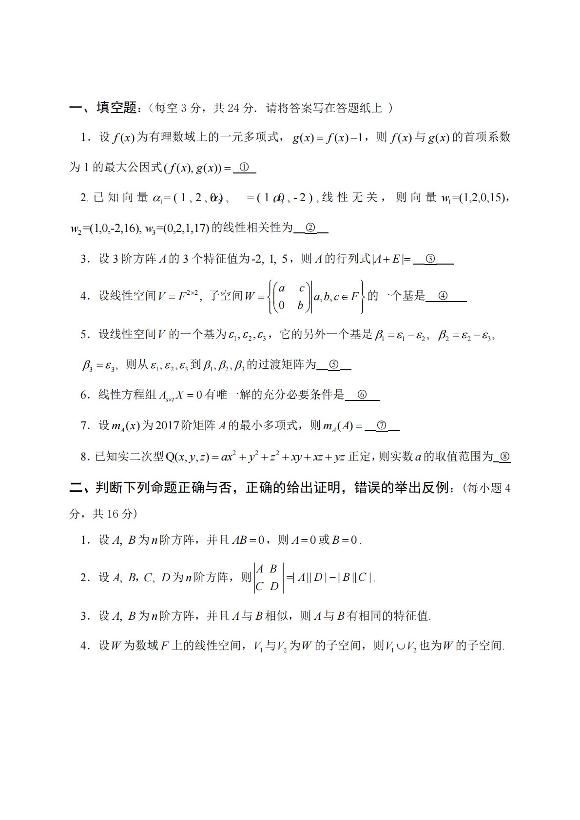 一、填空题:(每空3分,共24分.请将答案写在答题纸上)1.设fx()为有理数域上的一元多项式,gxfx()()1,则fx()与gx()的首项系数为1的最大公因式fxgx((),())○12.已知向量=(1,2,0),=(1,0,-2),=(0,2,1)123线性无关,则向量,w=(1,2,0,15)1ww=(1,0,-2,16),=(0,2,1,17)23的线性相关性为○23.设3阶方阵A的3个特征值为-2,1,5,则A的行列式AE||○34.设线性空间VF22,子空间bWabcFac0,,的一个基是○45.设线性空间V的一个基为...