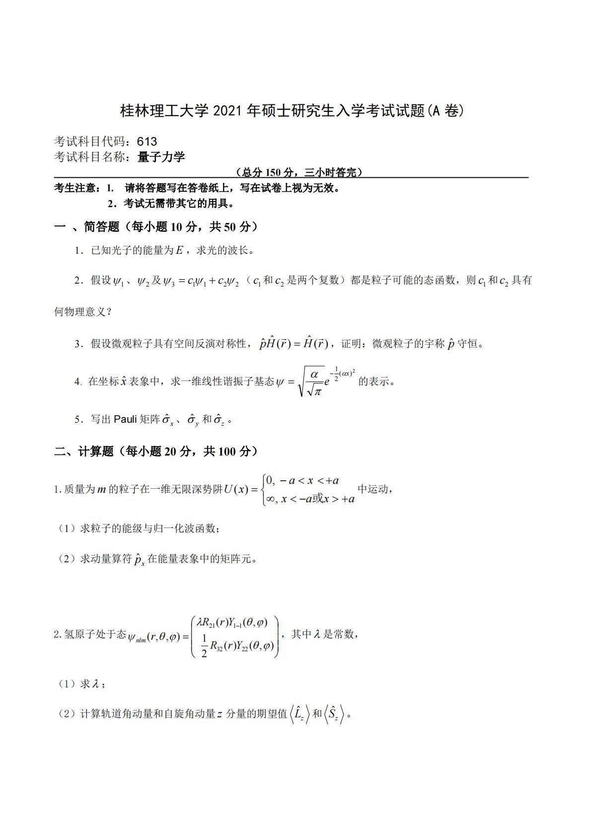 桂林理工大学2021年硕士研究生入学考试试题(A卷)考试科目代码:613考试科目名称:量子力学(总分150分,三小时答完)考生注意:1.请将答题写在答卷纸上,写在试卷上视为无效。2.考试无需带其它的用具。一、简答题(每小题10分,共50分)1.已知光子的能量为E,求光的波长。2.假设1、2及3c11c22(c1和c2是两个复数)都是粒子可能的态函数,则c1和c2具有何物理意义?3.假设微观粒子具有空间反演对称性,pˆHˆ(r)Hˆ(r),证明:微观粒子的宇称pˆ守恒。4.在坐标xˆ表象中,求一维线性谐振子基态1(x)2e2的表示。5.写出Pauli矩阵ˆx、...