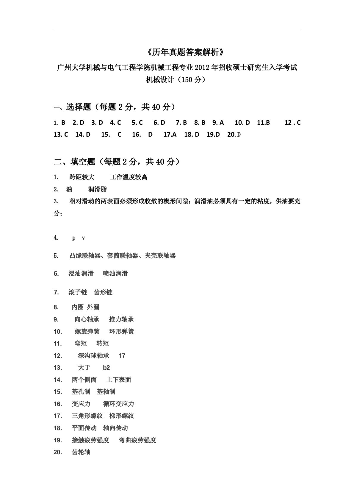 《历年真题答案解析》广州大学机械与电气工程学院机械工程专业2012年招收硕士研究生入学考试机械设计(150分)选择题(每题2分,共40分)B2.D3.D4.C5.C6.D7.B8.B9.A10.D11.B12.C13.C14.D15.C16.D17.A18.D19.D20.D填空题(每题2分,共40分)1.跨距较大工作温度较高2.油润滑脂3.相对滑动的两表面必须形成收敛的楔形间隙;润滑油必须具有一定的粘度,供油要充分;4.pv5.凸缘联轴器、套筒联轴器、夹壳联轴器6.浸油润滑喷油润滑7.滚子链齿形链8.内圈外圈9.向心轴承推力轴承10.螺旋弹簧环形弹簧11.弯矩转矩12.深沟球轴承1713.大...