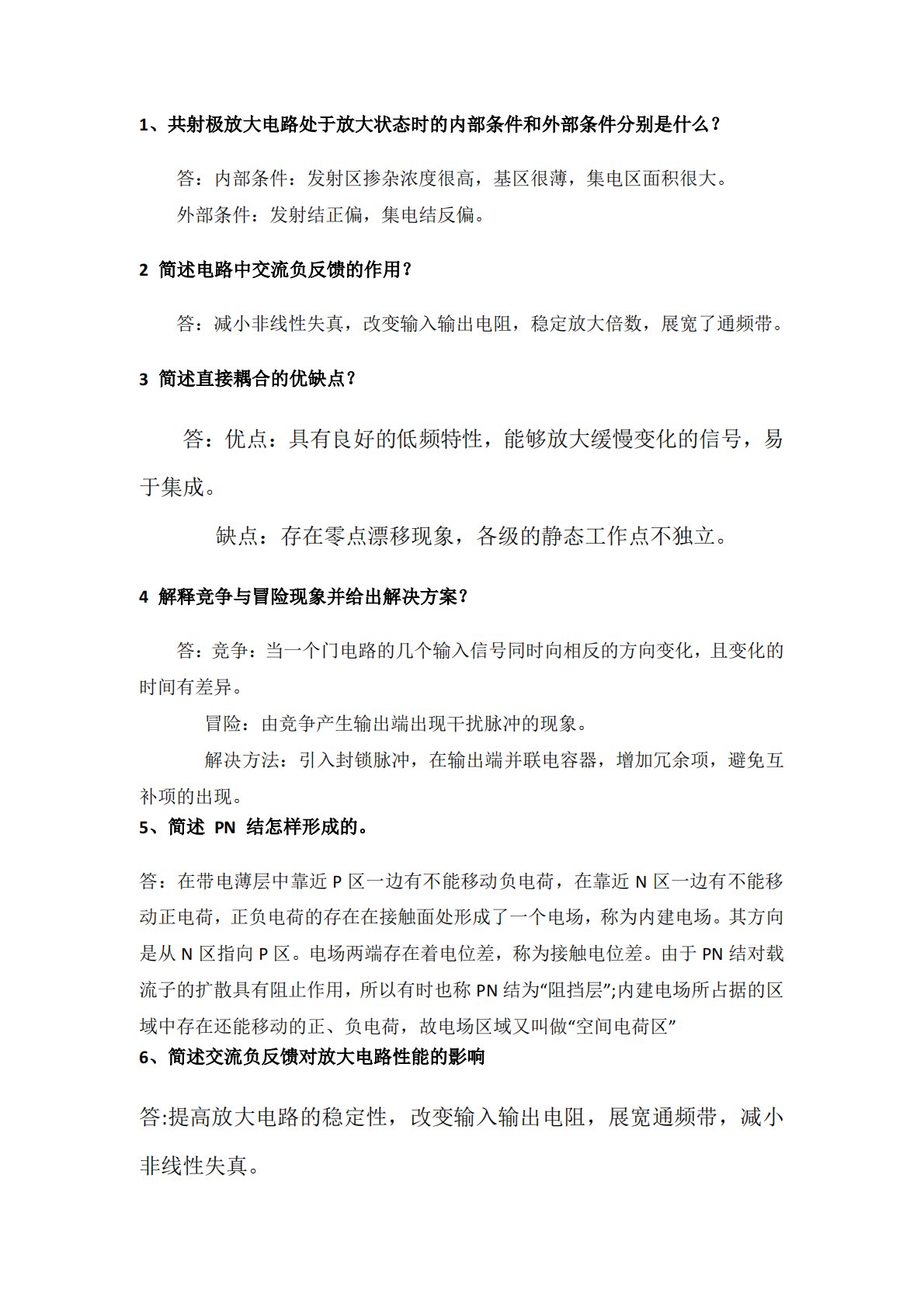 1、共射极放大电路处于放大状态时的内部条件和外部条件分别是什么?答:内部条件:发射区掺杂浓度很高,基区很薄,集电区面积很大。外部条件:发射结正偏,集电结反偏。2简述电路中交流负反馈的作用?答:减小非线性失真,改变输入输出电阻,稳定放大倍数,展宽了通频带。3简述直接耦合的优缺点?答:优点:具有良好的低频特性,能够放大缓慢变化的信号,易于集成。缺点:存在零点漂移现象,各级的静态工作点不独立。4解释竞争与冒险现象并给出解决方案?答:竞争:当一个门电路的几个输入信号同时向相反的方向变化,且变化的时间有差异。冒险:由竞争产生输出端出现干扰脉冲的现象。解决方法:引入封锁脉冲,在输出端并联电容器,增加冗余项...