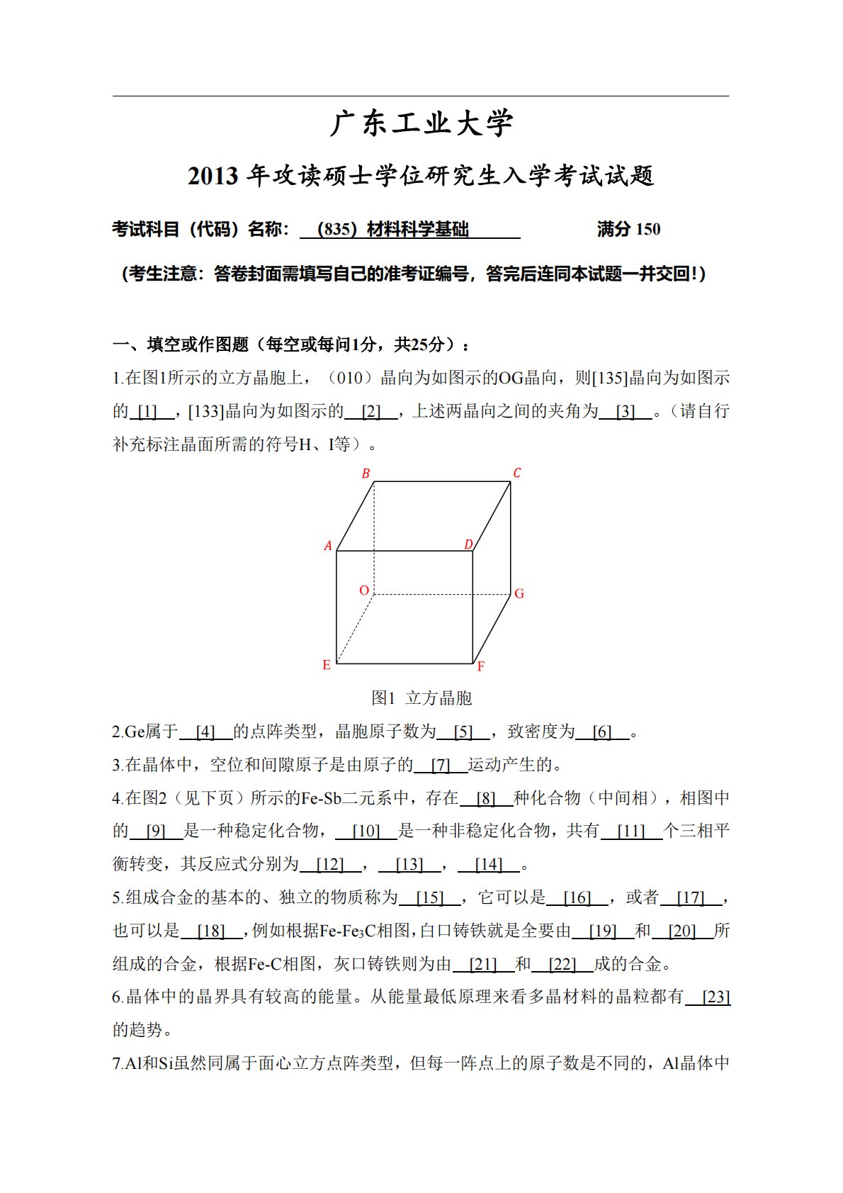 广东工业大学2013年攻读硕士学位研究生入学考试试题考试科目(代码)名称:(835)材料科学基础满分150(考生注意:答卷封面需填写自己的准考证编号,答完后连同本试题一并交回!)一、填空或作图题(每空或每问1分,共25分):1.在图1所示的立方晶胞上,(010)晶向为如图示的OG晶向,则[135]晶向为如图示的[1],[133]晶向为如图示的[2],上述两晶向之间的夹角为[3]。(请自行补充标注晶面所需的符号H、I等)。图1立方晶胞2.Ge属于[4]的点阵类型,晶胞原子数为[5],致密度为[6]。3.在晶体中,空位和间隙原子是由原子的[7]运动产生的。4.在图2(见下页)所示的Fe-Sb二元系...