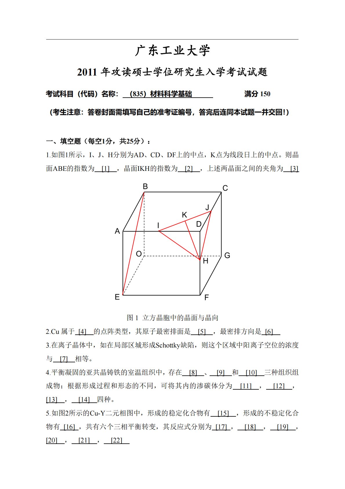 广东工业大学2011年攻读硕士学位研究生入学考试试题考试科目(代码)名称:(835)材料科学基础满分150(考生注意:答卷封面需填写自己的准考证编号,答完后连同本试题一并交回!)一、填空题(每空1分,共25分):1.如图1所示,I、J、H分别为AD、CD、DF上的中点,K点为线段日上的中点。则晶面ABE的指数为[1],晶面IKH的指数为[2],上述两晶面之间的夹角为[3]图1立方晶胞中的晶面与晶向2.Cu属于[4]的点阵类型,其原子最密排面是[5],最密排方向是[6]3.在离子晶体中,如在局部区城形成Schottky缺陷,则这个区域中阳离子空位的浓度与[7]相等。4.平衡凝固的亚共晶铸铁的室温...