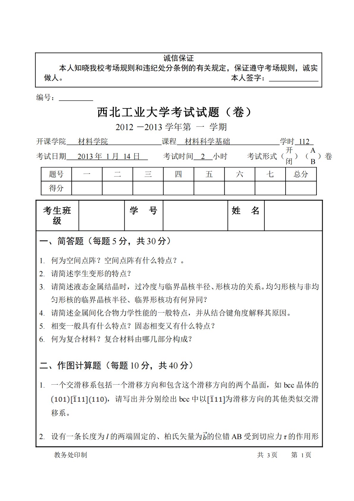 诚信保证本人知晓我校考场规则和违纪处分条例的有关规定,保证遵守考场规则,诚实做人。本人签字:编号:西北工业大学考试试题(卷)2012-2013学年第一学期开课学院材料学院课程材料科学基础学时112考试日期2013年1月14日考试时间 2 小时考试形式(闭开)(BA)卷题号一二三四五六七总分得分考生班级学 号姓 名一、简答题(每题5分,共30分)1.何为空间点阵?空间点阵有什么特点?。2.请简述孪生变形的特点?3.请简述液态金属结晶时,过冷度与临界晶核半径、形核功的关系。均匀形核与非均匀形核的临界晶核半径、临界形核功有何异同?4.请简述金属间化合物力学性能的一般特点,并从结合键角度解释其原因。5...