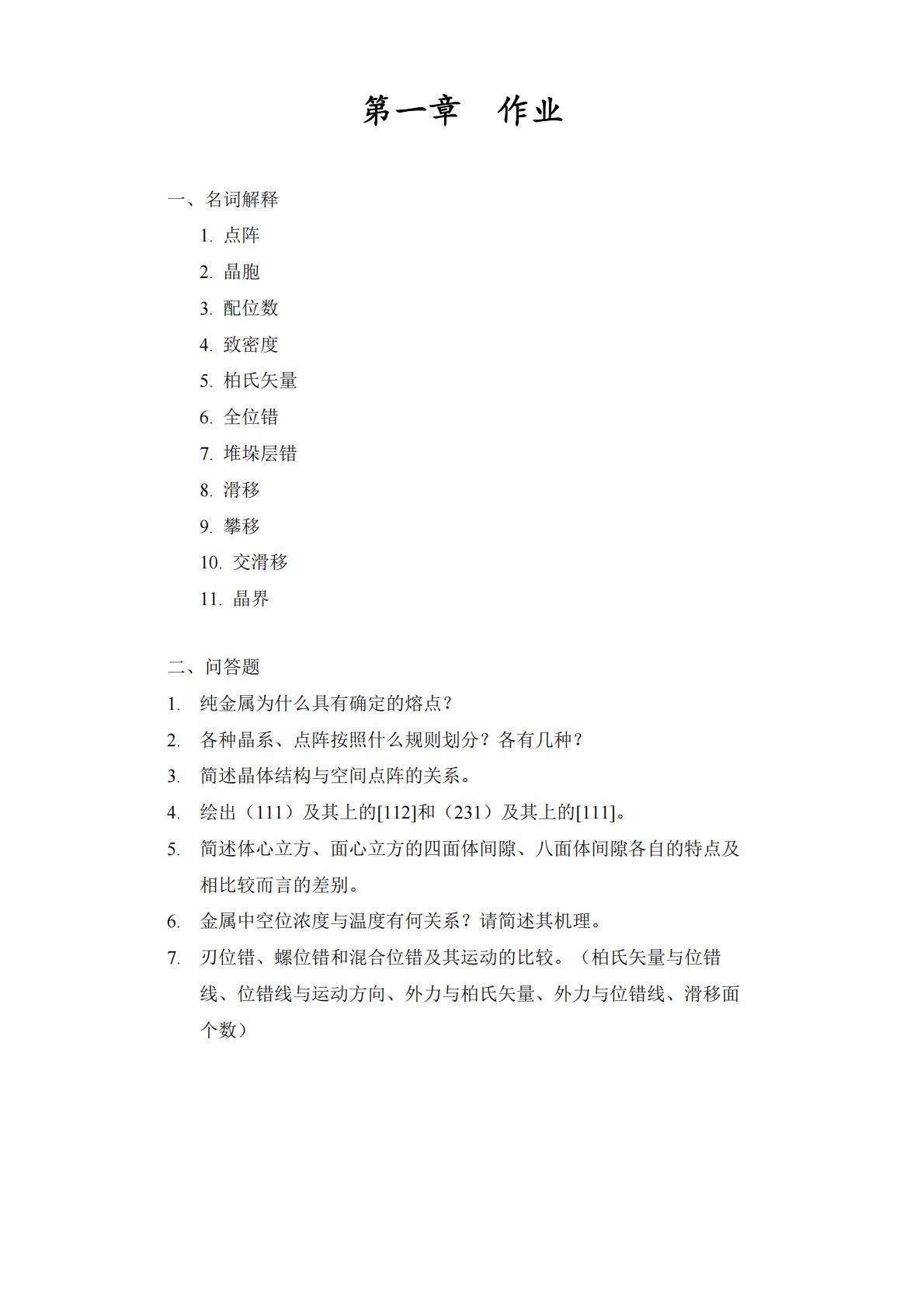 第一章作业一、名词解释1.点阵2.晶胞3.配位数4.致密度5.柏氏矢量6.全位错7.堆垛层错8.滑移9.攀移10.交滑移11.晶界二、问答题1.纯金属为什么具有确定的熔点?2.各种晶系、点阵按照什么规则划分?各有几种?3.简述晶体结构与空间点阵的关系。4.绘出(111)及其上的[112]和(231)及其上的[111]。5.简述体心立方、面心立方的四面体间隙、八面体间隙各自的特点及相比较而言的差别。6.金属中空位浓度与温度有何关系?请简述其机理。7.刃位错、螺位错和混合位错及其运动的比较。(柏氏矢量与位错线、位错线与运动方向、外力与柏氏矢量、外力与位错线、滑移面个数)8.请推导螺位错应变能公式。...