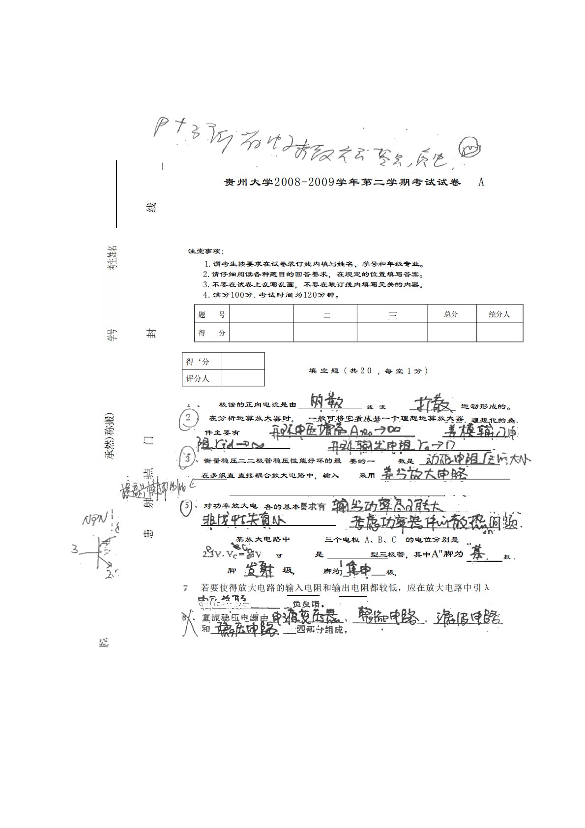 贵州大学2008-2009学年第二学期考试试卷A注堂事项:1.谓考生按要求在试卷装订线内填写姓名、学号和年级专业。2.请仔细阅读各种题目的回答要求,在规定的位置填写答案。3.不要在试卷上乱写乱画,不要在装订线内填写元关的内器。4.满分100分.考试时间为120分钟。题号二三总分统分人得分得‘分评分人极铵的正向电流是由线流运动形成的。在分析运算放大器时,一般可将它看成县一个理想运算放大器件主要有衡量稳压二二极管稳压性能好坏的最要的一数是在多级直直接耦合放大电路中,输入采用对功率放大电各的基本某放大电路中可脚圾,若要使得放大电路的输入电阻和输出电阻都较低,应在放大电路中引λ三个电极A、B、C的电位...