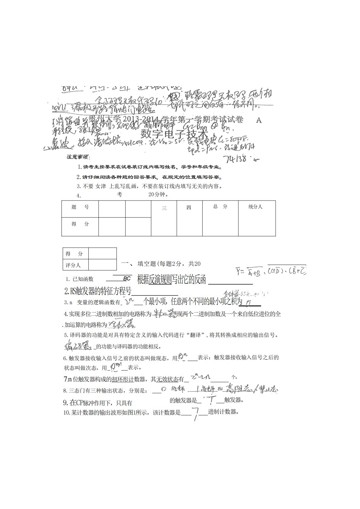 注意事项:1.请考生按要求在试卷装订线内填写姓名、学号和年级专业。2.请仔细阅读各种题的回答要求,在规定的位置填写答察。3.不要女津上乱写乱画,不要在装订线内填写无关的内容。4.考20分钟。题号三四总分统分人得分得分评分人1.已知函数BC根据反演规则写出它的反函2.RS触发器的特征方程号3.n变量的逻辑函数有个最小项,任意两个不同的最小项之积为4.实现多位二进制数相加的电路称为现两个二进制加数及一个来自低位进位的全.加运算的电路称为5.译码器的功能是对具有特定含义的输入代码进行“翻译”,将其转换成相应的输出信号。_的功能与译码器的功能相反。6.触发器接收输入信号之前的状态叫做现态,用表示:触发...
