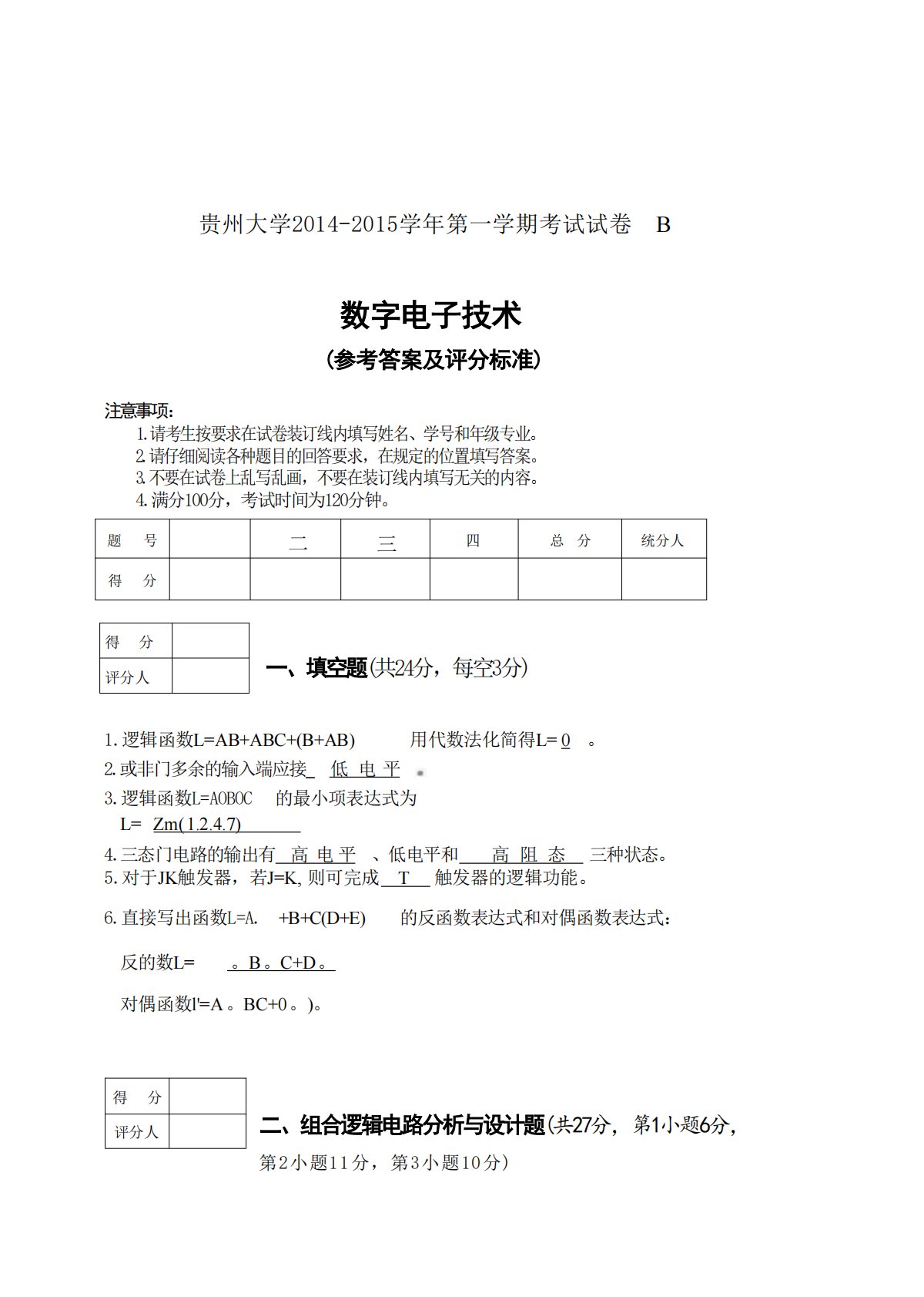 贵州大学2014-2015学年第一学期考试试卷B数字电子技术(参考答案及评分标准)注意事项:1.请考生按要求在试卷装订线内填写姓名、学号和年级专业。2.请仔细阅读各种题目的回答要求,在规定的位置填写答案。3.不要在试卷上乱写乱画,不要在装订线内填写无关的内容。4.满分100分,考试时间为120分钟。题号二三四总分统分人得分得分评分人1.逻辑函数L=AB+ABC+(B+AB)用代数法化简得L=0。2.或非门多余的输入端应接_低电平3.逻辑函数L=AOBOC的最小项表达式为L=Zm(1.2.4.7)4.三态门电路的输出有高电平、低电平和高阻态三种状态。5.对于JK触发器,若J=K,则可完成T触发器...