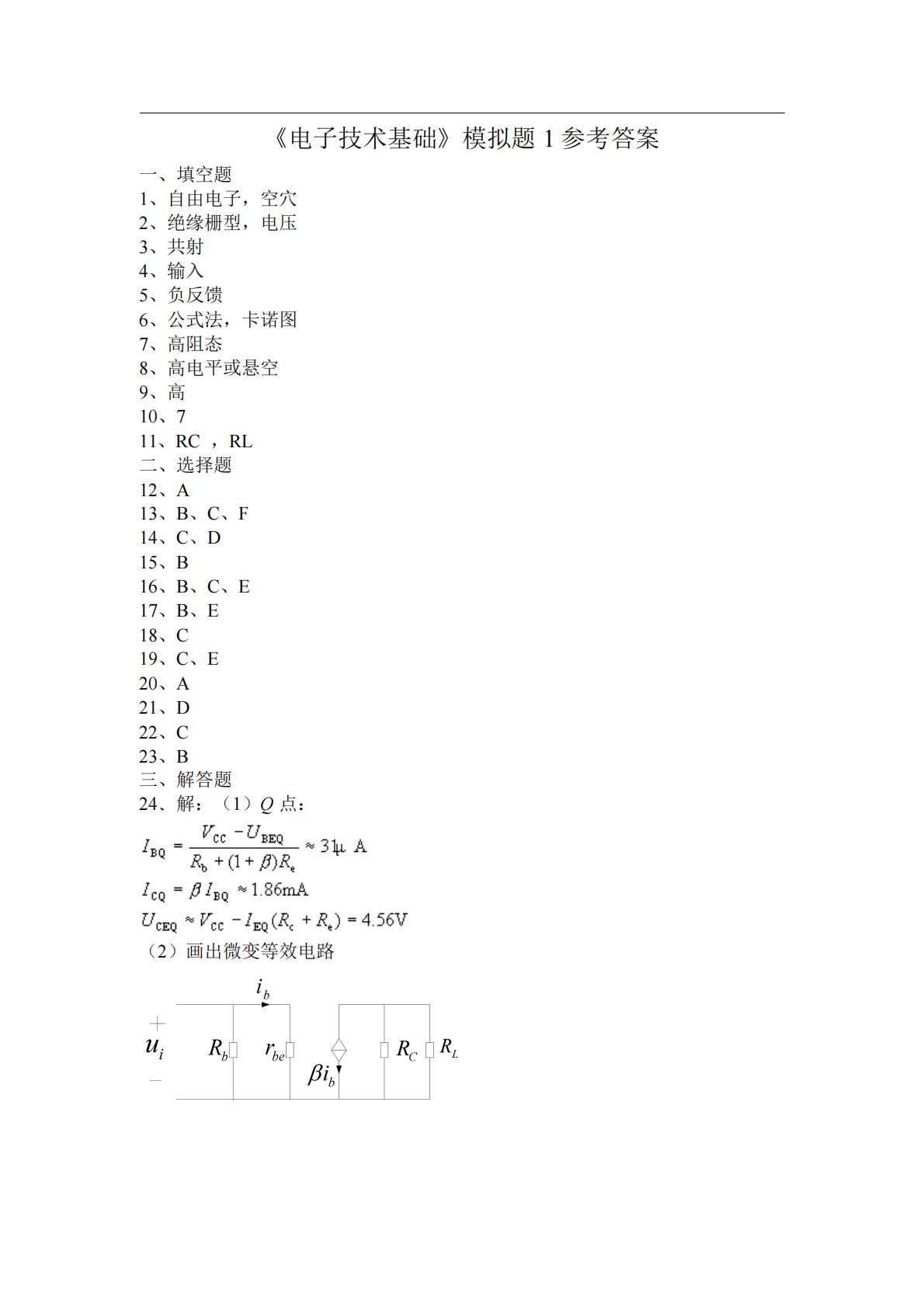 《电子技术基础》模拟题1参考答案一、填空题1、自由电子,空穴2、绝缘栅型,电压3、共射4、输入5、负反馈6、公式法,卡诺图7、高阻态8、高电平或悬空9、高10、711、RC,RL二、选择题12、A13、B、C、F14、C、D15、B16、B、C、E17、B、E18、C19、C、E20、A21、D22、C23、B三、解答题24、解:(1)Q点:(2)画出微变等效电路第2页共4页动态分析:(3)设Us=10mV(有效值),则若C3开路,则25、解:RW滑动端在中点时T1管和T2管的发射极静态电流分析如下:Ad和Ri分析如下:26、(1)画出真值表(2)写出表达式CABCABY帮考研专业课辅导...