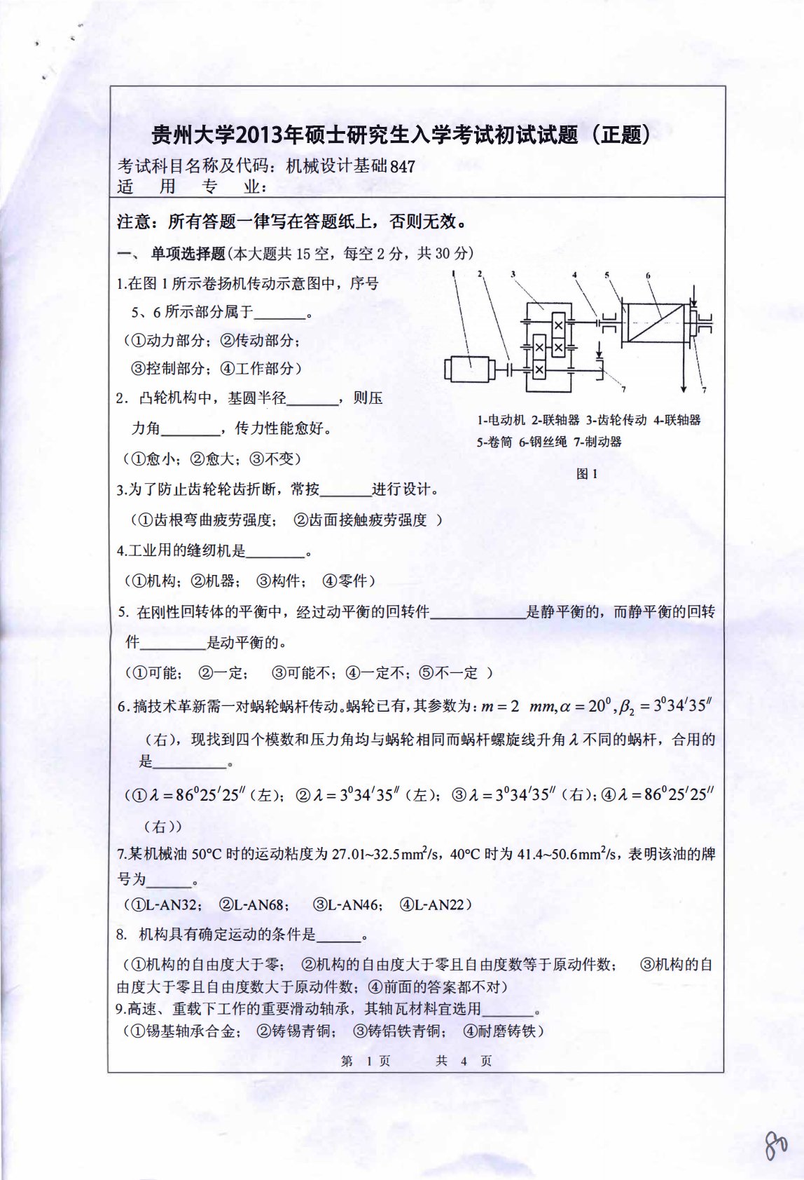..--.贵州大学2013年硕士研究生入学考试初试试题(正题)考试科目名称及代码:机械设计基础847适用专业:注意:所有答题一律写在答题纸上,否则无效。l在图1所示卷扬机传动示意图中,序号5、6所示部分属于。((D动力部分;@传动部分;@控制部分;@工作部分)2.凸轮机构中,基圆半径,则压力角,传力性能愈好。((D愈小;@愈大;@不变)3为了防止齿轮轮齿折断,常按进行设计。((D齿根弯曲疲劳强度;@齿面接触疲劳强度)4.工业用的缝纫机是。((D机构;@机器;@构件;@零件)5.在刚性回转体的平衡中,经过动平衡的回转件件是动平衡的。((D可能;@一定;@可能不;@一定不;@不一定)1-电动机2-...