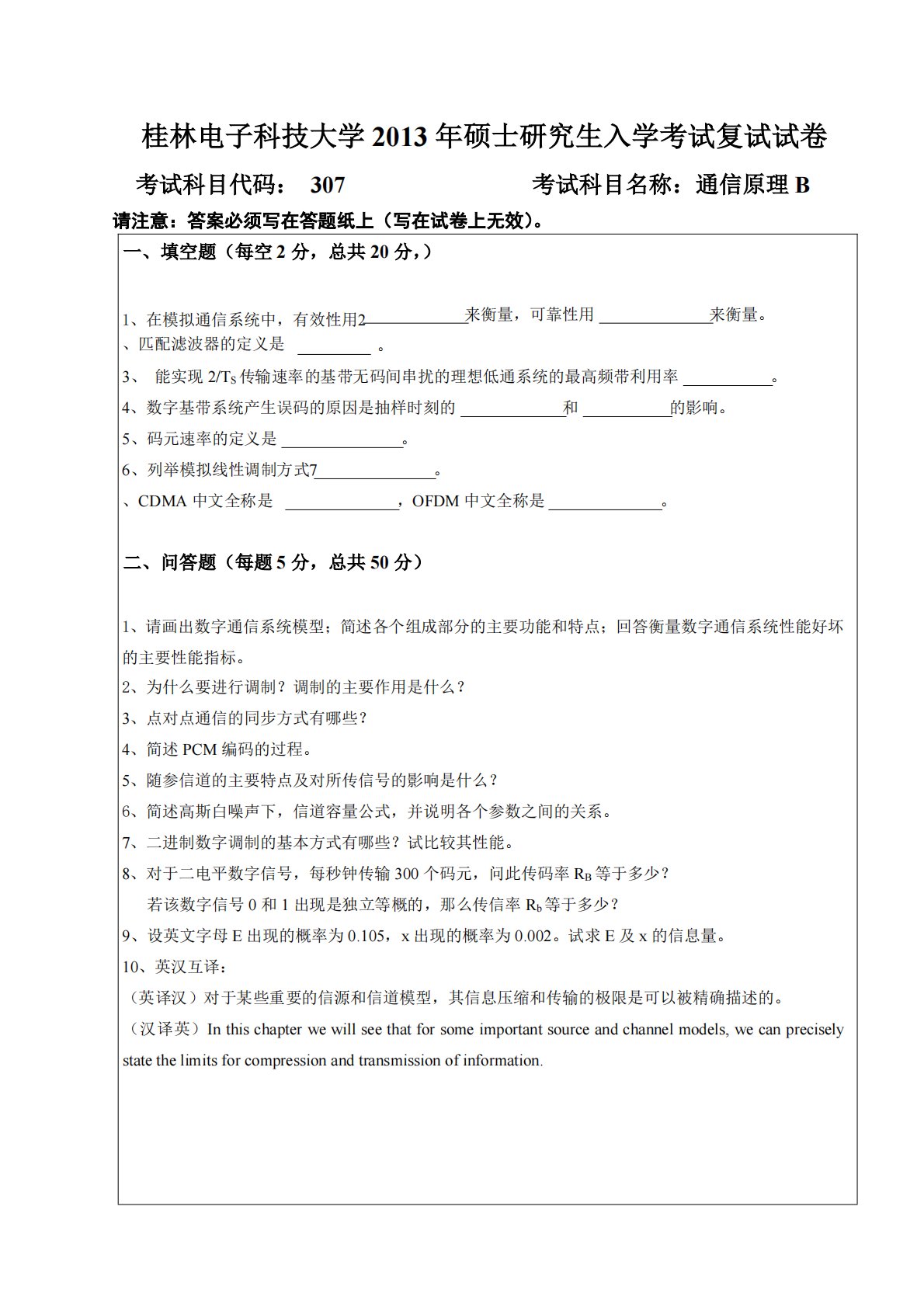 桂林电子科技大学2013年硕士研究生入学考试复试试卷考试科目名称:通信原理B考试科目代码:307请注意:答案必须写在答题纸上(写在试卷上无效)。一、填空题(每空2分,总共20分,)来衡量,可靠性用来衡量。1、在模拟通信系统中,有效性用2、匹配滤波器的定义是。3、能实现2/TS传输速率的基带无码间串扰的理想低通系统的最高频带利用率。4、数字基带系统产生误码的原因是抽样时刻的和的影响。。。5、码元速率的定义是6、列举模拟线性调制方式7、CDMA中文全称是,OFDM中文全称是。二、问答题(每题5分,总共50分)1、请画出数字通信系统模型;简述各个组成部分的主要功能和特点;回答衡量数字通信系统性能好坏...