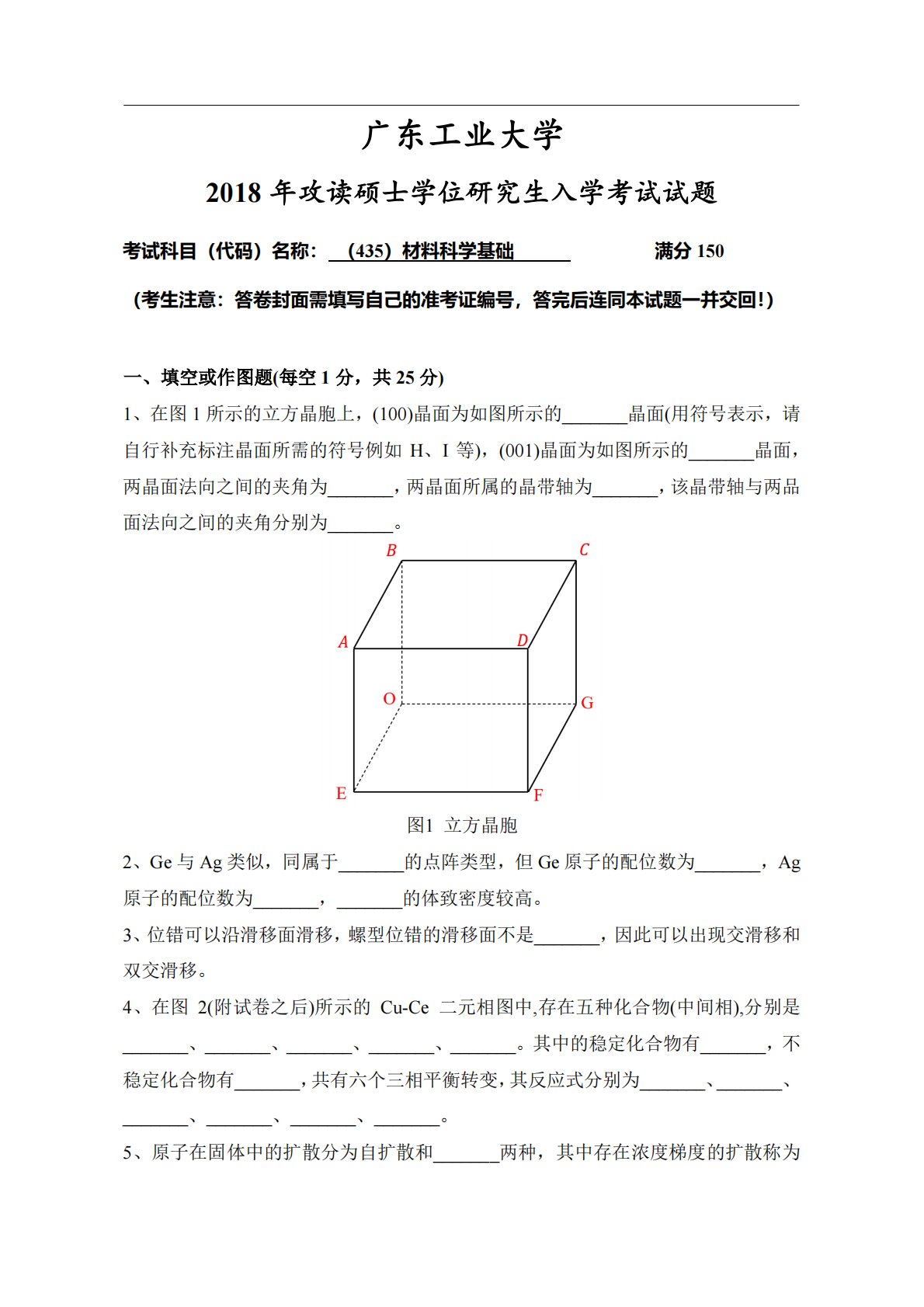 广东工业大学2018年攻读硕士学位研究生入学考试试题考试科目(代码)名称:(435)材料科学基础满分150(考生注意:答卷封面需填写自己的准考证编号,答完后连同本试题一并交回!)一、填空或作图题(每空1分,共25分)1、在图1所示的立方晶胞上,(100)晶面为如图所示的_______晶面(用符号表示,请自行补充标注晶面所需的符号例如H、I等),(001)晶面为如图所示的_______晶面,两晶面法向之间的夹角为_______,两晶面所属的晶带轴为_______,该晶带轴与两品面法向之间的夹角分别为_______。图1立方晶胞2、Ge与Ag类似,同属于_______的点阵类型,但Ge原子的配位数...