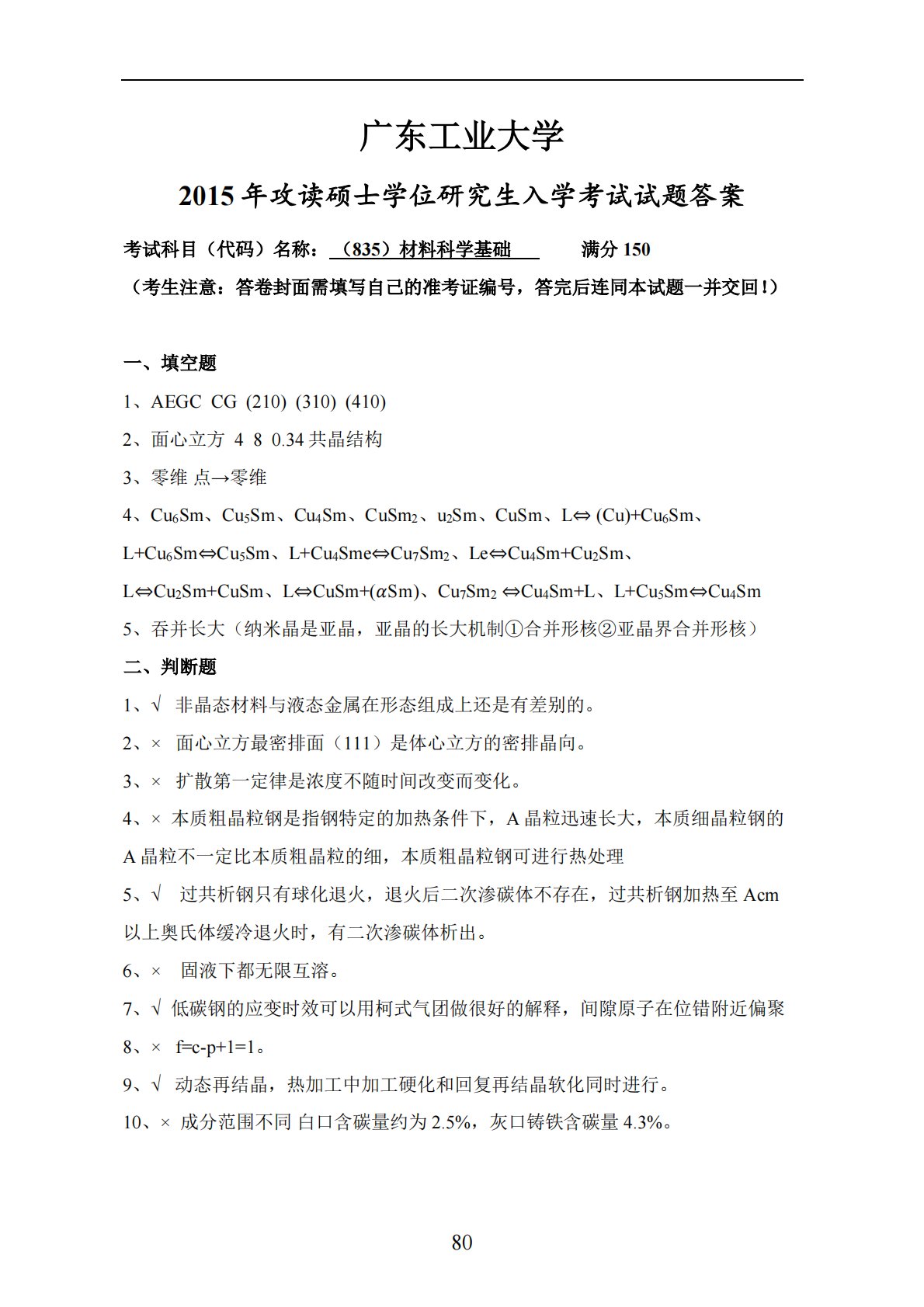 80广东工业大学2015年攻读硕士学位研究生入学考试试题答案考试科目(代码)名称:(835)材料科学基础满分150(考生注意:答卷封面需填写自己的准考证编号,答完后连同本试题一并交回!)一、填空题1、AEGCCG(210)(310)(410)2、面心立方480.34共晶结构3、零维点→零维4、Cu6Sm、Cu5Sm、Cu4Sm、CuSm2、u2Sm、CuSm、L⇔(Cu)+Cu6Sm、L+Cu6Sm⇔Cu5Sm、L+Cu4Sme⇔Cu7Sm2、Le⇔Cu4Sm+Cu2Sm、L⇔Cu2Sm+CuSm、L⇔CuSm+(Sm)、Cu7Sm2⇔Cu4Sm+L、L+Cu5Sm⇔...